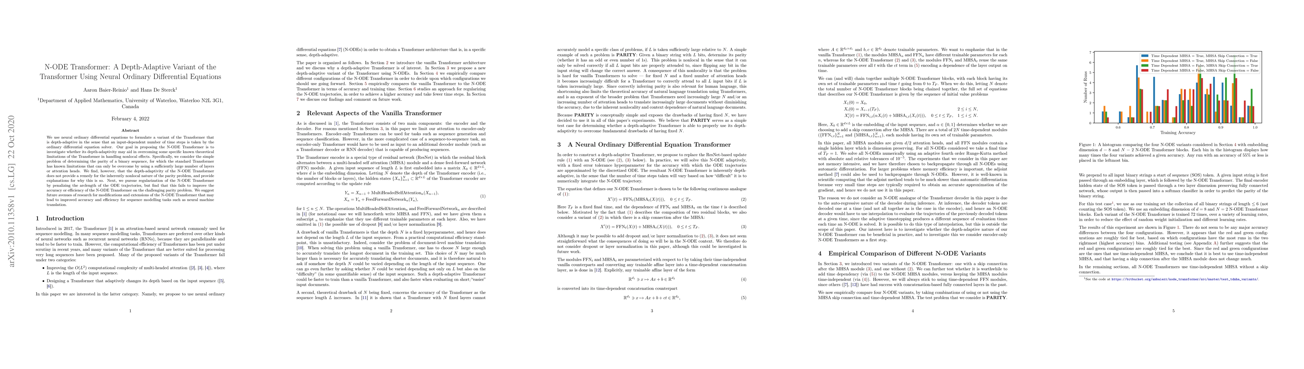 The N-ODE Transformer, a depth-adaptive variant of the Transformer using neural ordinary differential equations, aims to address the Transformer's limitations in handling nonlocal effects. Despite its depth-adaptivity, it fails to improve performance on the parity problem, suggesting further research is needed for enhancements in sequence modeling tasks.