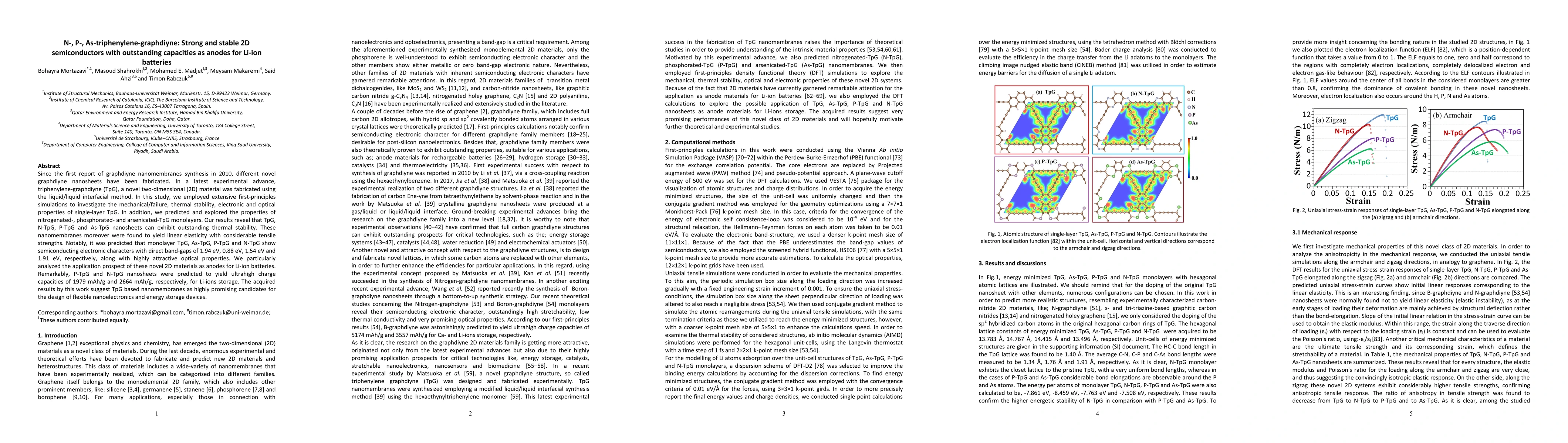 The study investigates triphenylene-graphdiyne (TpG) nanosheets synthesized via liquid/liquid interfacial methods, revealing strong mechanical/thermal stability and semiconducting properties. The N-, P-, and As-doped TpG variants are projected to deliver excellent performance as anodes in Li-ion batteries, with P-TpG and N-TpG showing ultrahigh charge capacities of 1979 mAh/g and 2664 mAh/g, respectively.