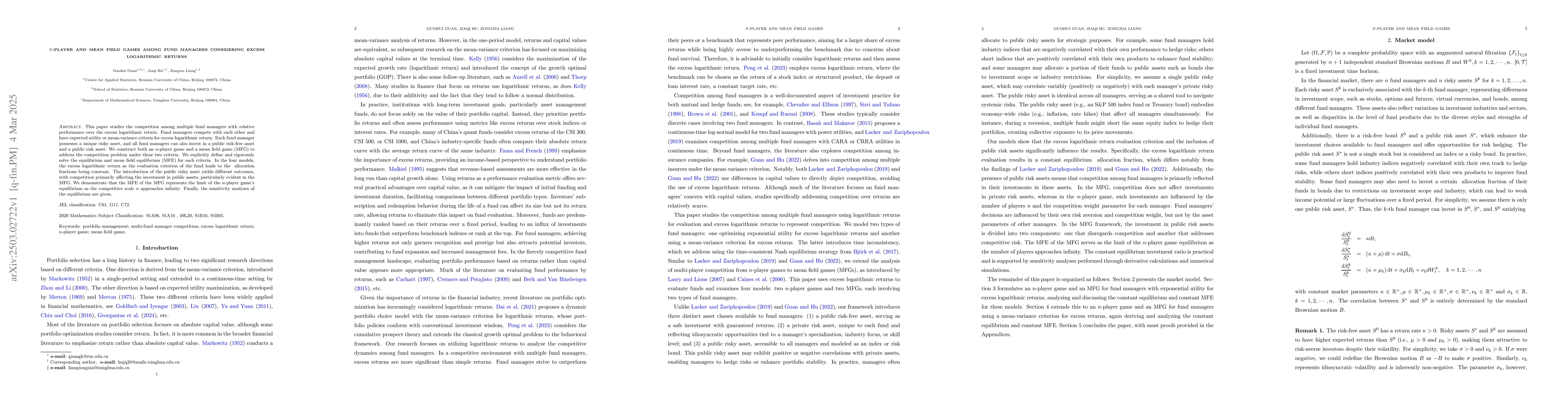 This work distinguishes itself by focusing on excess logarithmic returns and incorporating both n-player and mean field game frameworks to analyze fund manager competition, demonstrating the convergence of the n-player game equilibrium to the MFE as the number of competitors grows.