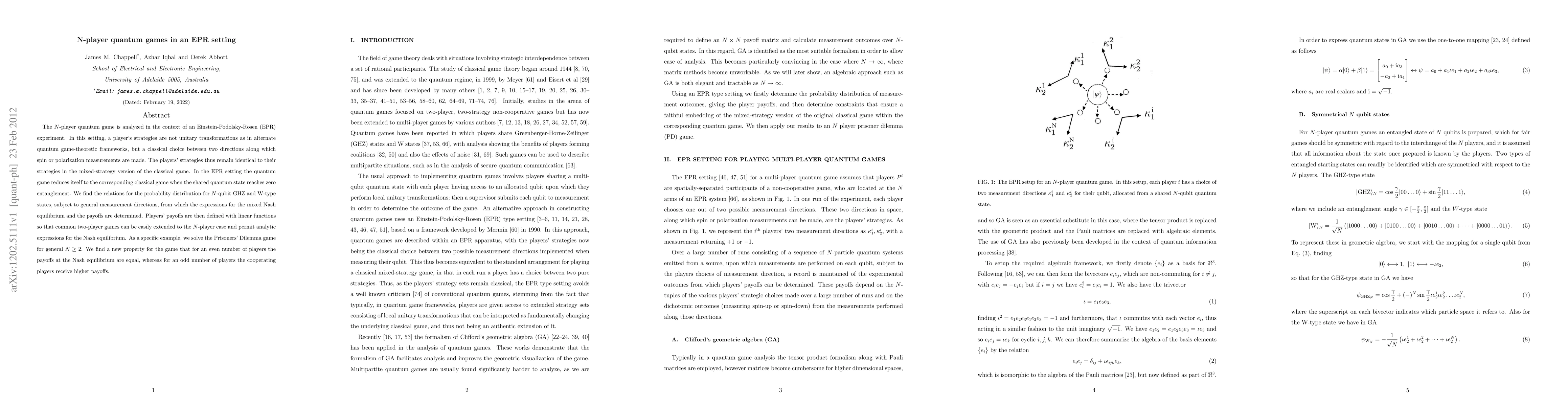 The $N$-player quantum game is analyzed in the context of an Einstein-Podolsky-Rosen (EPR) experiment. In this setting, a player's strategies are not unitary transformations as in alternate quantum game-theoretic frameworks, but a classical choice between two directions along which spin or polarization measurements are made. The players' strategies thus remain identical to their strategies in the mixed-strategy version of the classical game. In the EPR setting the quantum game reduces itself to the corresponding classical game when the shared quantum state reaches zero entanglement. We find the relations for the probability distribution for $N$-qubit GHZ and W-type states, subject to general measurement directions, from which the expressions for the mixed Nash equilibrium and the payoffs are determined. Players' payoffs are then defined with linear functions so that common two-player games can be easily extended to the $N$-player case and permit analytic expressions for the Nash equilibrium. As a specific example, we solve the Prisoners' Dilemma game for general $ N \ge 2 $. We find a new property for the game that for an even number of players the payoffs at the Nash equilibrium are equal, whereas for an odd number of players the cooperating players receive higher payoffs.