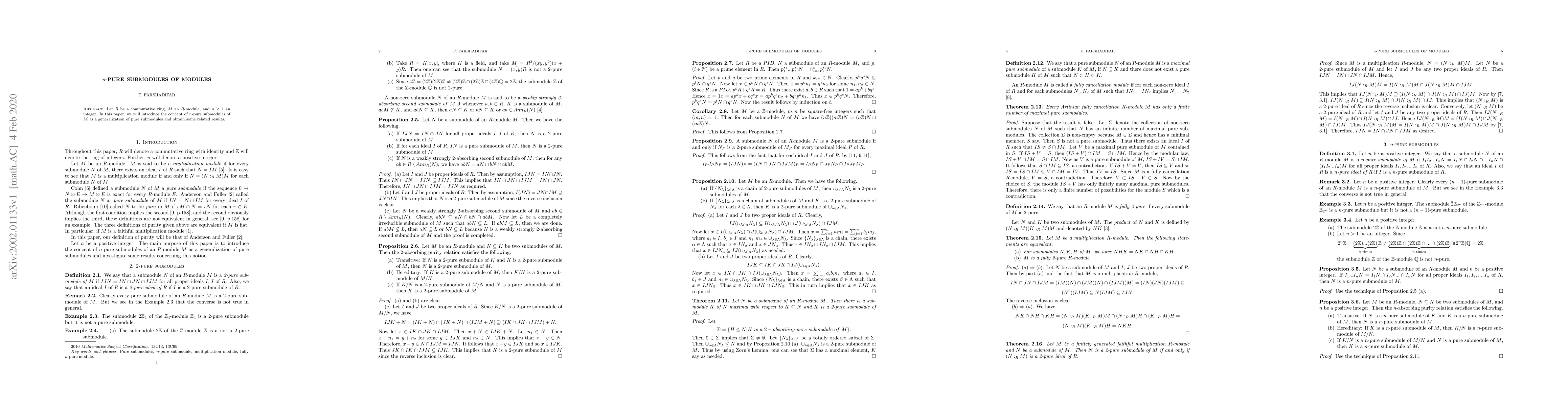 This paper introduces n-pure submodules, a generalization of pure submodules, for R-modules over a commutative ring R and provides related theoretical results.