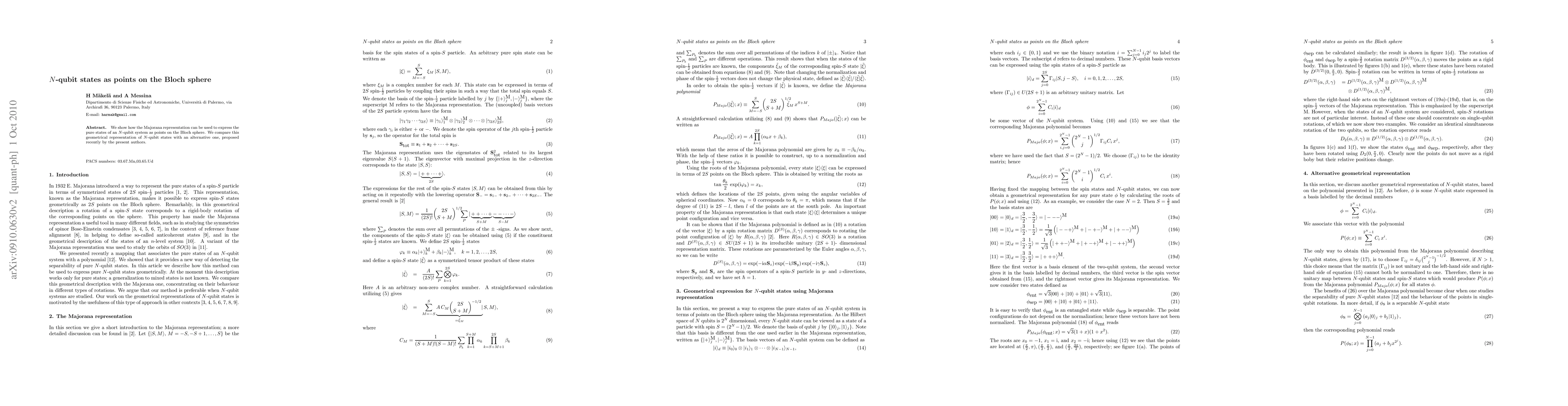 This paper demonstrates how the Majorana representation translates the pure states of an N-qubit system into points on the Bloch sphere, comparing this geometric depiction with an earlier alternative representation proposed by the authors.