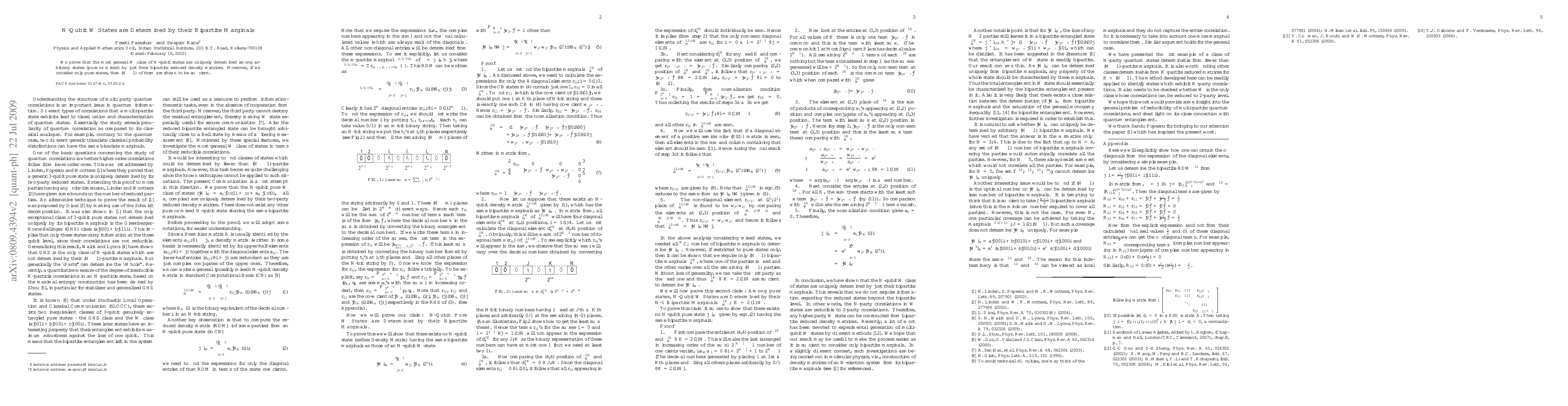 Summary: This paper demonstrates that N-qubit W states are uniquely identified by their bipartite marginal density matrices, and for pure states, only (N-1) of these marginals are necessary for this identification.