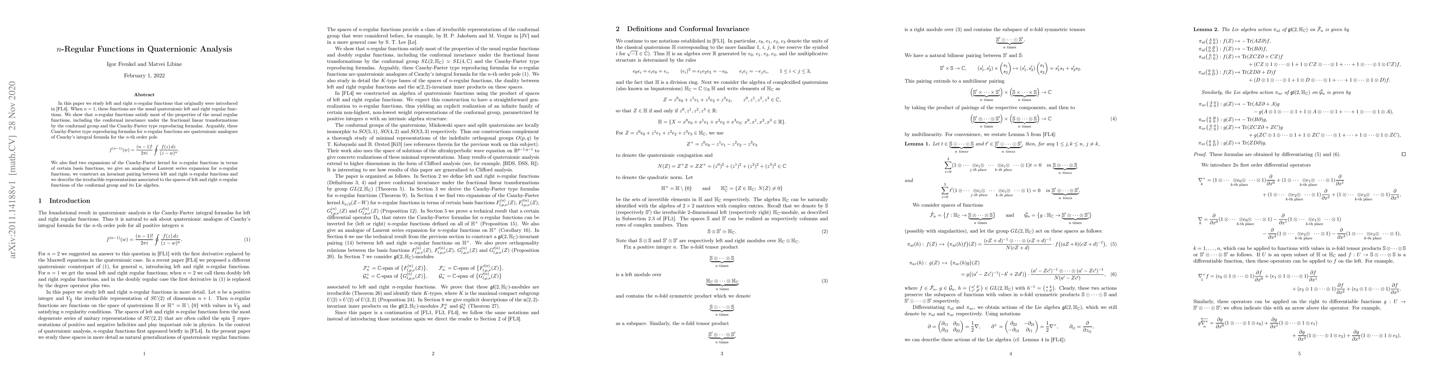 This paper explores n-regular functions in quaternionic analysis, demonstrating they maintain properties of regular functions, including conformal invariance and Cauchy-Fueter type reproducing formulas, with extensions to Laurent series expansions and invariant pairings for left and right n-regular functions.