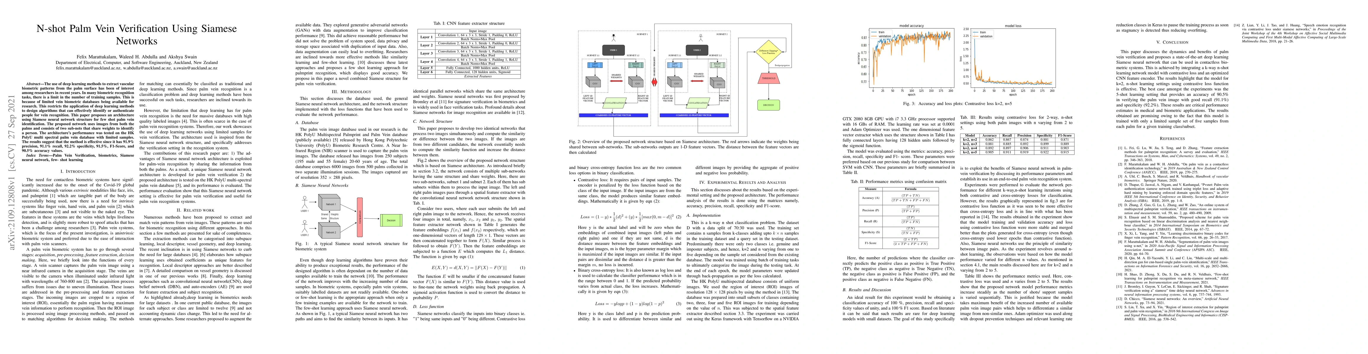 This paper proposes a Siamese neural network architecture for few-shot palm vein verification, leveraging shared weights between two sub-networks to identify individuals using limited training samples. The method achieved high accuracy and precision on the HK PolyU multi-spectral palm vein database, demonstrating its effectiveness.