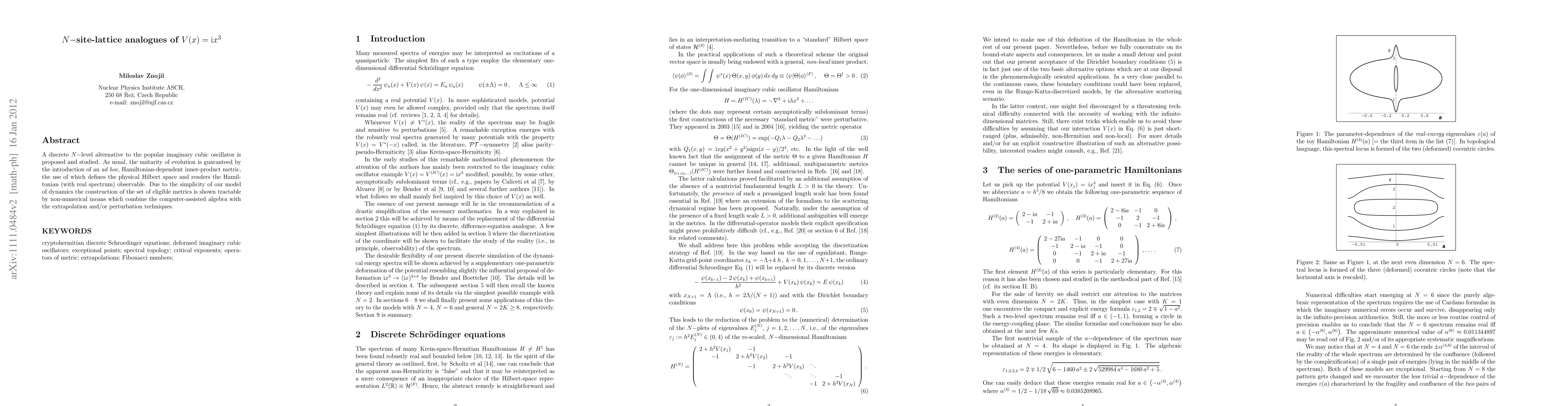 Two discrete N-level alternatives to the popular imaginary cubic oscillator are proposed and studied. In a certain domain ${\cal D}$ of parameters $a$ and $z$ of the model, the spectrum of energies is shown real (i.e., potentially, observable) and the unitarity of the evolution is shown mediated by the construction of a (non-unique) physical, ad hoc Hilbert space endowed with a nontrivial, Hamiltonian-dependent inner-product metric $\Theta$. Beyond ${\cal D}$ the complex-energy curves are shown to form a "Fibonacci-numbered" geometric pattern and/or a "topologically complete" set of spectral loci. The dynamics-determining construction of the set of the eligible metrics is shown tractable by a combination of the computer-assisted algebra with the perturbation and extrapolation techniques. Confirming the expectation that for the local potentials the effect of the metric cannot be short-ranged.
