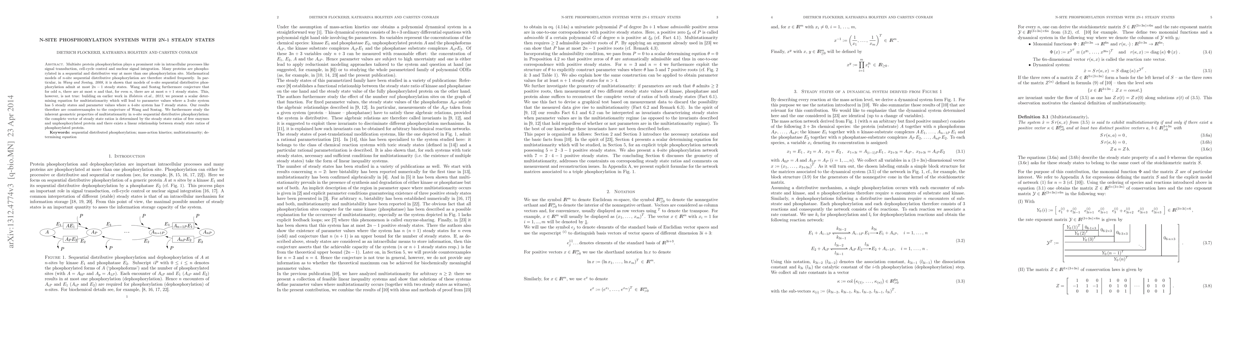 Multisite protein phosphorylation plays a prominent role in intracellular processes like signal transduction, cell-cycle control and nuclear signal integration. Many proteins are phosphorylated in a sequential and distributive way at more than one phosphorylation site. Mathematical models of $n$-site sequential distributive phosphorylation are therefore studied frequently. In particular, in {\em Wang and Sontag, 2008,} it is shown that models of $n$-site sequential distributive phosphorylation admit at most $2n-1$ steady states. Wang and Sontag furthermore conjecture that for odd $n$, there are at most $n$ and that, for even $n$, there are at most $n+1$ steady states. This, however, is not true: building on earlier work in {\em Holstein et.al., 2013}, we present a scalar determining equation for multistationarity which will lead to parameter values where a $3$-site system has $5$ steady states and parameter values where a $4$-site system has $7$ steady states. Our results therefore are counterexamples to the conjecture of Wang and Sontag. We furthermore study the inherent geometric properties of multistationarity in $n$-site sequential distributive phosphorylation: the complete vector of steady state ratios is determined by the steady state ratios of free enzymes and unphosphorylated protein and there exists a linear relationship between steady state ratios of phosphorylated protein.