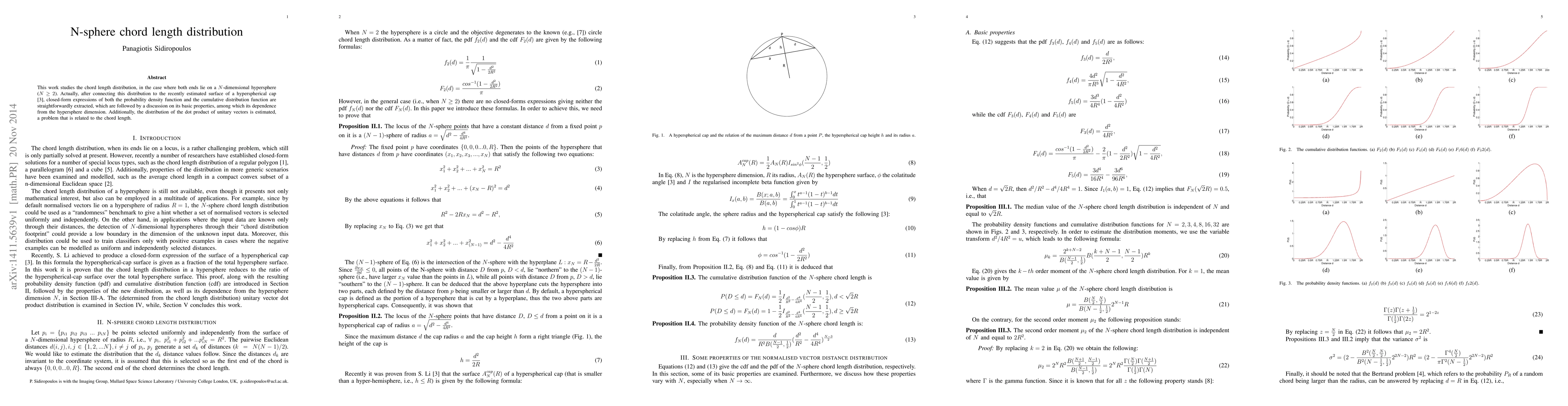 This paper derives closed-form expressions for the probability density function and cumulative distribution function of chord lengths on an $N$-dimensional hypersphere, linking them to the surface of a hyperspherical cap. It also examines the distribution of the dot product of unitary vectors, highlighting the dependence of these distributions on the hypersphere's dimension.