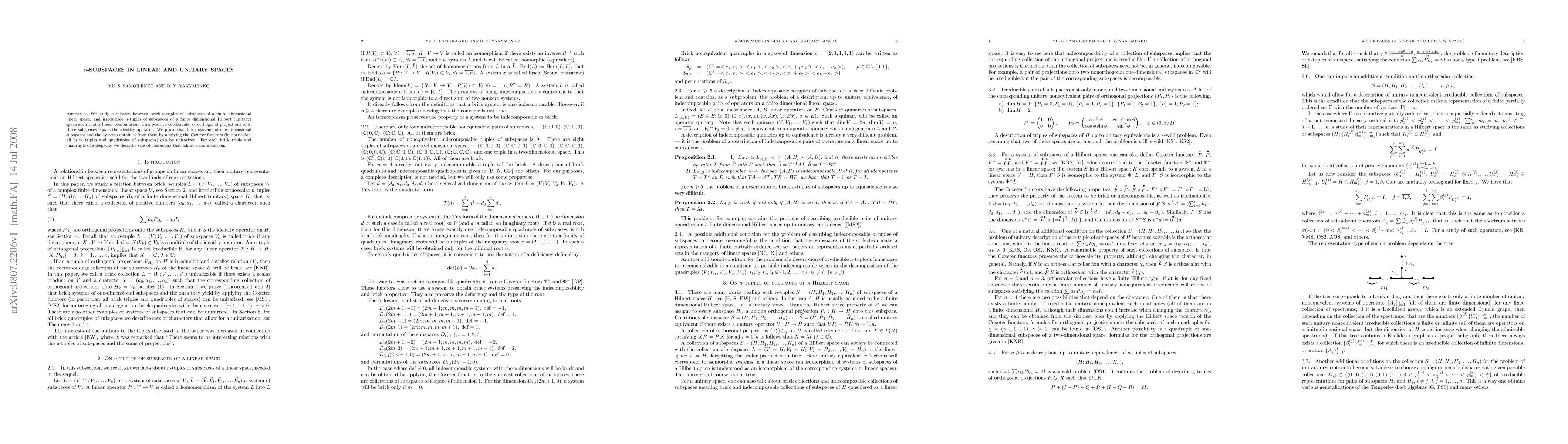 Researchers investigate how certain subspaces in linear spaces can be transformed into unitary spaces, with implications for understanding irreducible tuples of subspaces.