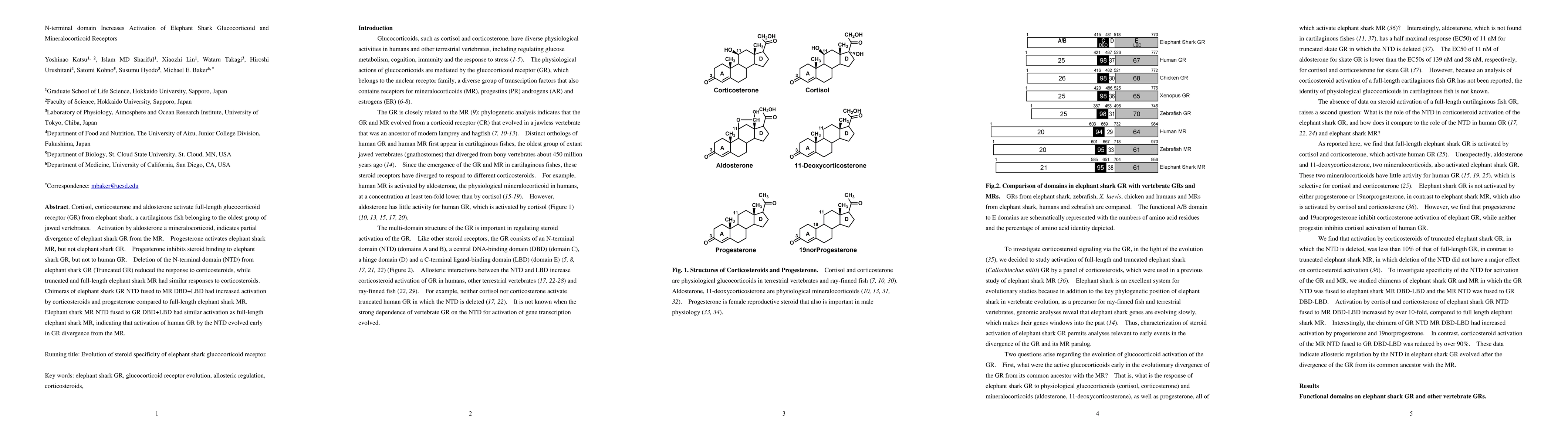 The N-terminal domain (NTD) of the elephant shark glucocorticoid receptor (GR) enhances its activation by corticosteroids, while the NTD of the mineralocorticoid receptor (MR) does not affect GR activation. The study highlights the evolutionary divergence of GR and MR in ancient vertebrates.