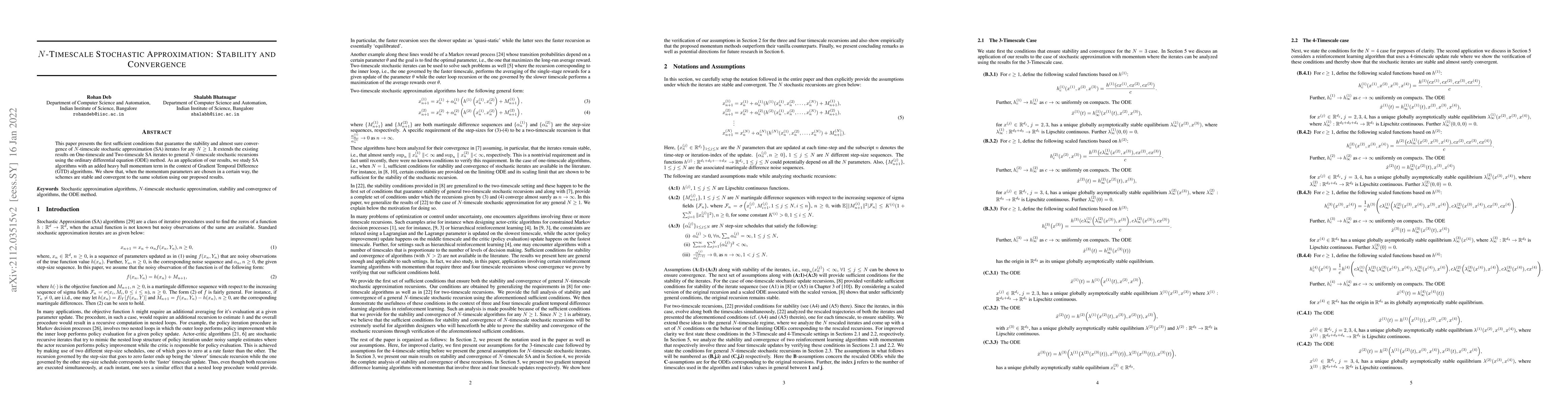This paper presents the first sufficient conditions that guarantee the stability and almost sure convergence of $N$-timescale stochastic approximation (SA) iterates for any $N\geq1$. It extends the existing results on One-timescale and Two-timescale SA iterates to general $N$-timescale stochastic recursions using the ordinary differential equation (ODE) method. As an application of our results, we study SA algorithms with an added heavy ball momentum term in the context of Gradient Temporal Difference (GTD) algorithms. We show that, when the momentum parameters are chosen in a certain way, the schemes are stable and convergent to the same solution using our proposed results.
