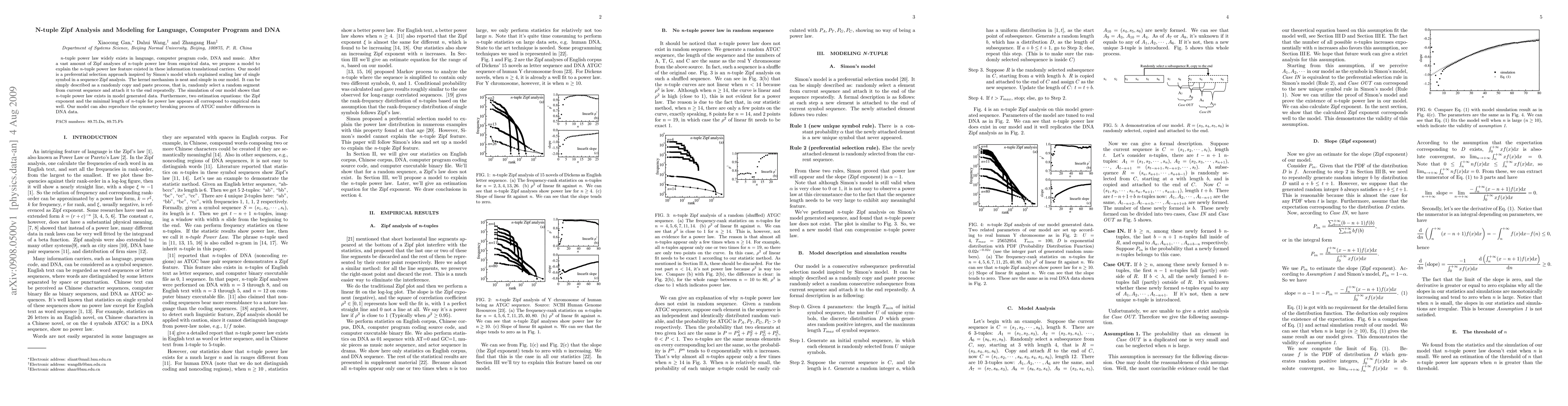 n-tuple power law widely exists in language, computer program code, DNA and music. After a vast amount of Zipf analyses of n-tuple power law from empirical data, we propose a model to explain the n-tuple power law feature existed in these information translational carriers. Our model is a preferential selection approach inspired by Simon's model which explained scaling law of single symbol in a sequence Zipf analysis. The kernel mechanism is neat and simple in our model. It can be simply described as a randomly copy and paste process, that is, randomly select a random segment from current sequence and attach it to the end repeatedly. The simulation of our model shows that n-tuple power law exists in model generated data. Furthermore, two estimation equations: the Zipf exponent and the minimal length of n-tuple for power law appears all correspond to empirical data well. Our model can also reproduce the symmetry breaking process of ATGC number differences in DNA data.