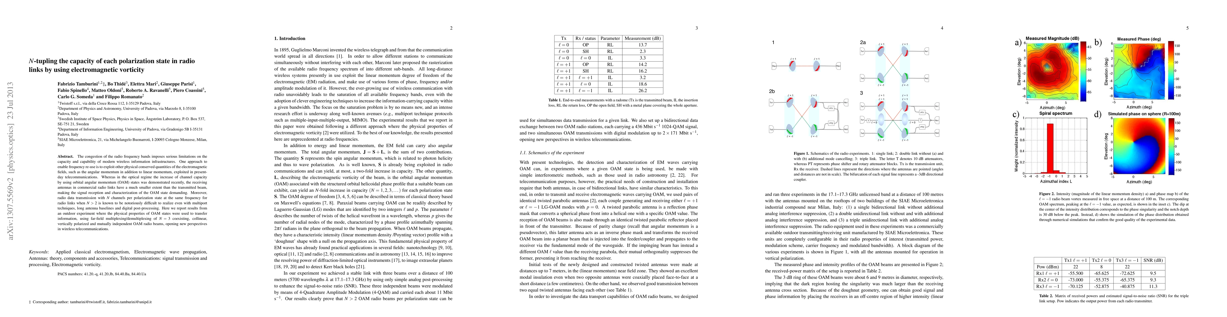 The congestion of the radio frequency bands imposes serious limitations on the capacity and capability of modern wireless information infrastructures. One approach to enable frequency re-use is to exploit other physical conserved quantities of the electromagnetic fields, such as the orbital angular momentum (OAM) in addition to linear momentum, which is exploited in present-day telecommunications. Whereas in the optical regime the increase of channel capacity by using OAM states was demonstrated recently, the receiving antennas in commercial radio links have a much smaller extent than the transmitted beam, making the signal reception and characterization of the OAM state demanding. Moreover, radio data transmission with more than two channels per polarization state at the same frequency for radio links is known to be notoriously difficult to realize even with multiport techniques, long antenna baselines and digital post-processing. Here we report results from an outdoor, proof of concept experiment where the physical properties of OAM states were used to transfer information, using far-field multiplexing/demultiplexing of three coexisting collinear, vertically polarized and mutually independent OAM radio beams, opening new perspectives in wireless telecommunications.