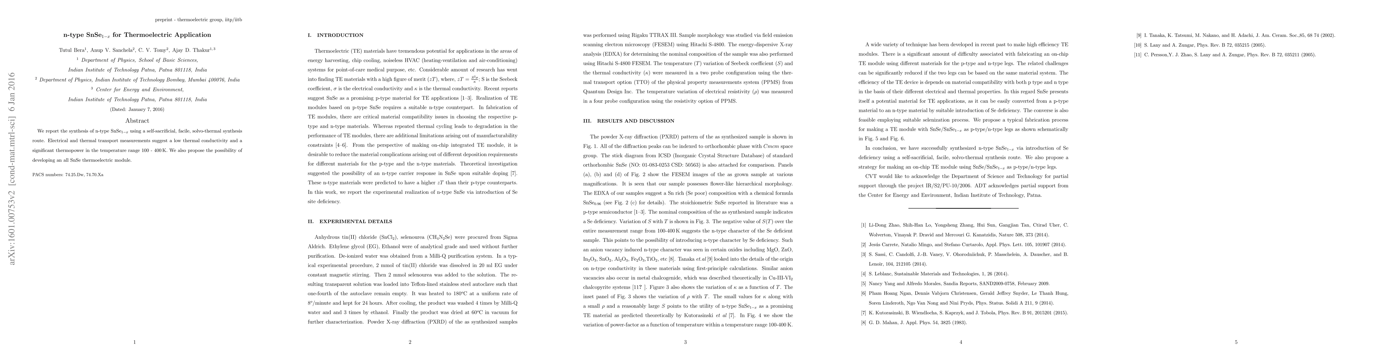 A self-sacrificial, solvo-thermal synthesis route was used to synthesize n-type SnSe1-x