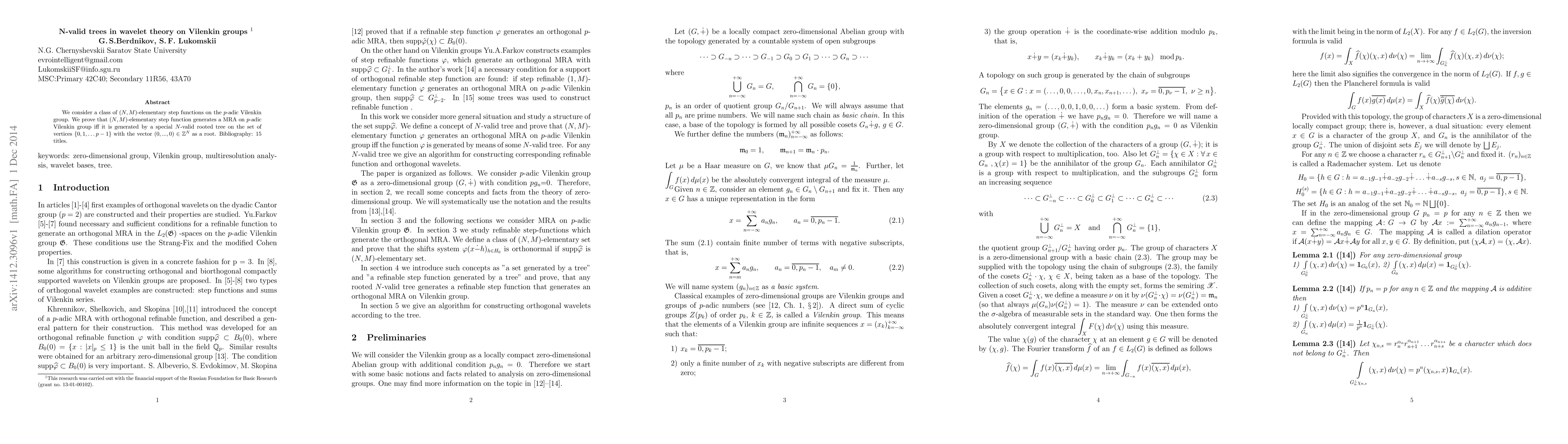 This paper explores $(N,M)$-elementary step functions on the $p$-adic Vilenkin group, proving that such functions generate a multiresolution analysis (MRA) if they are associated with a specific $N$-valid rooted tree structure. The study references 15 titles to support its findings.
