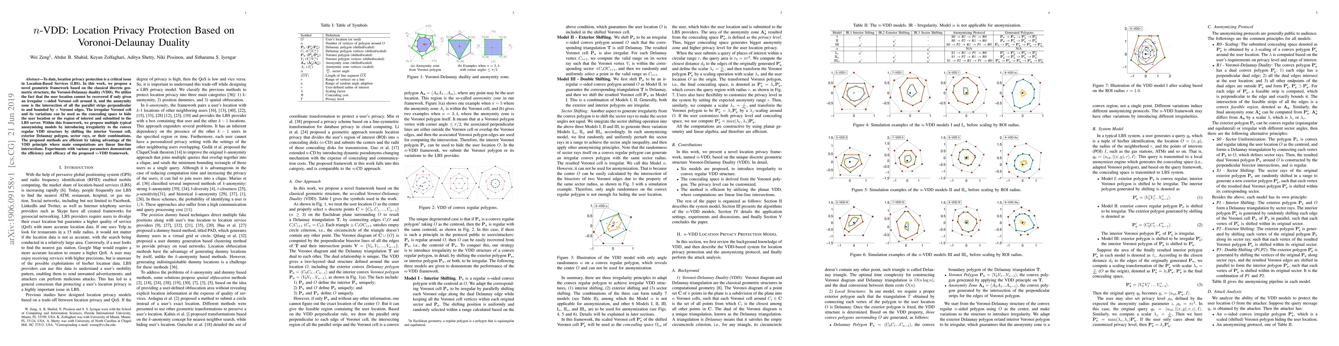 This paper proposes a novel $n$-VDD framework for location privacy protection in Location-Based Services (LBS) using Voronoi-Delaunay duality. It introduces irregular Voronoi cells to conceal user locations, ensuring anonymity through the intersection of parallel strips bounded by $n$ Voronoi edges, and demonstrates efficient anonymizing models leveraging linear computations.