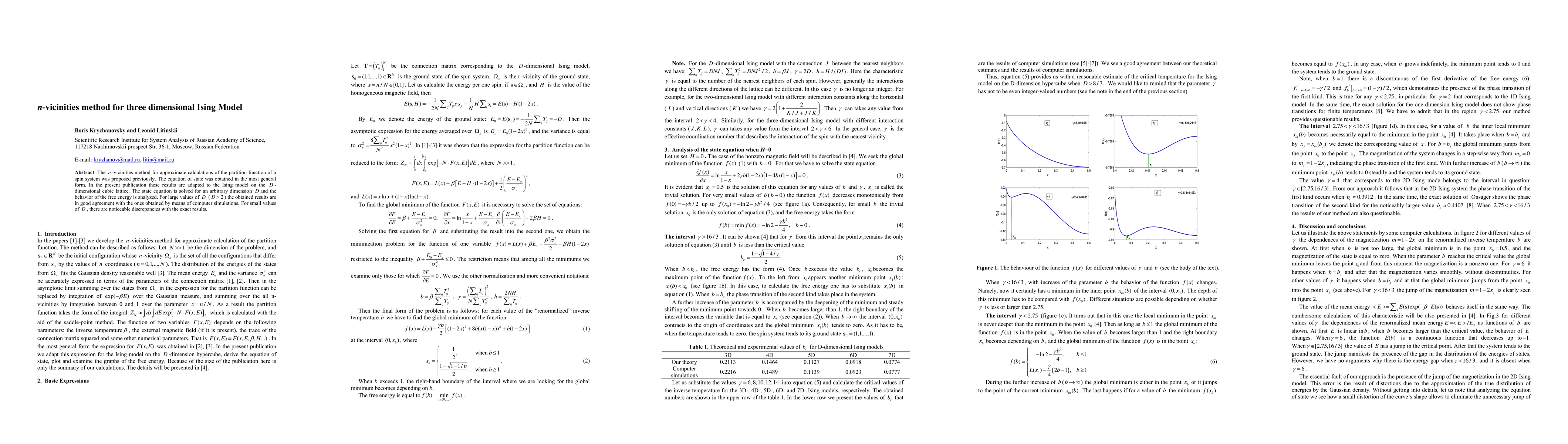 The n-vicinities method for approximate calculations of the partition function of a spin system was proposed previously. The equation of state was obtained in the most general form. In the present publication these results are adapted to the Ising model on the D-dimensional cubic lattice. The state equation is solved for an arbitrary dimension D and the behavior of the free energy is analyzed. For large values of D (D > 2) the obtained results are in good agreement with the ones obtained by means of computer simulations. For small values of D (D < 3), there are noticeable discrepancies with the exact results.