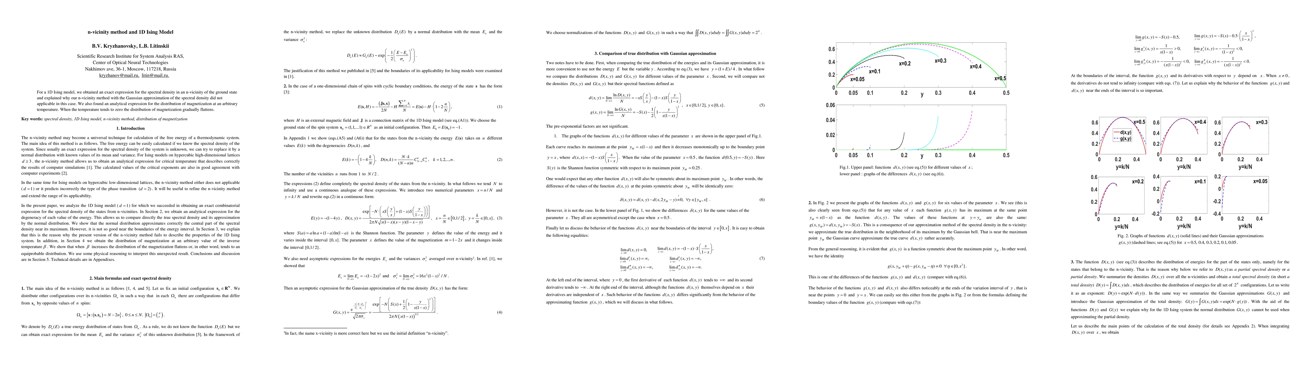 For a 1D Ising model, we obtained an exact expression for the spectral density in an n-vicinity of the ground state and explained why our n-vicinity method with the Gaussian approximation of the spectral density did not applicable in this case. We also found an analytical expression for the distribution of magnetization at an arbitrary temperature. When the temperature tends to zero the distribution of magnetization gradually flattens.