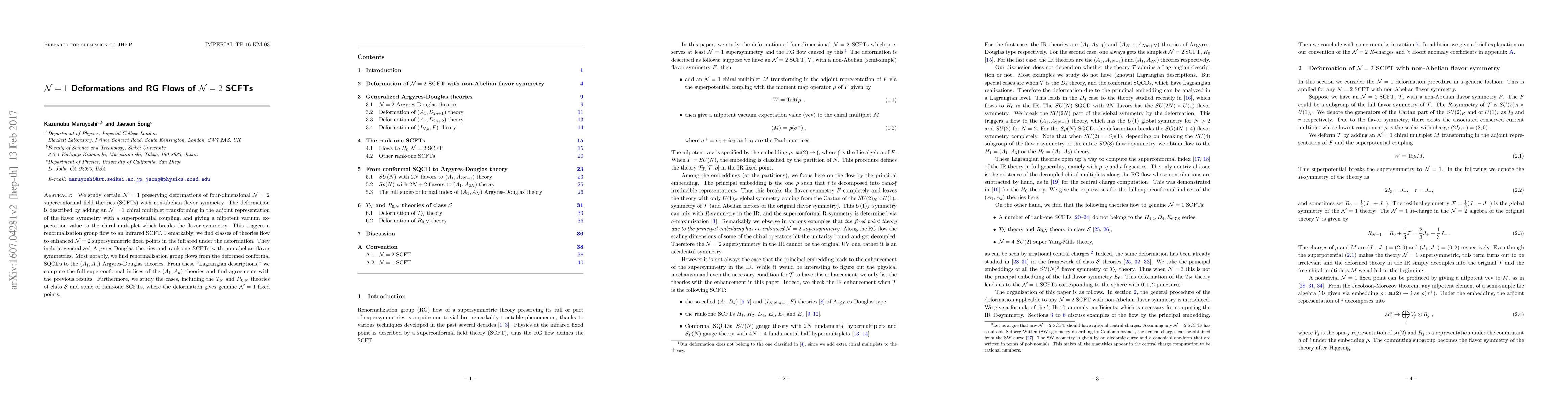 This paper investigates N=1 preserving deformations of N=2 superconformal field theories in four dimensions, focusing on non-abelian flavor symmetries. The study reveals that certain deformations lead to renormalization group flows to enhanced N=2 supersymmetric fixed points, including generalized Argyres-Douglas theories and rank-one SCFTs.