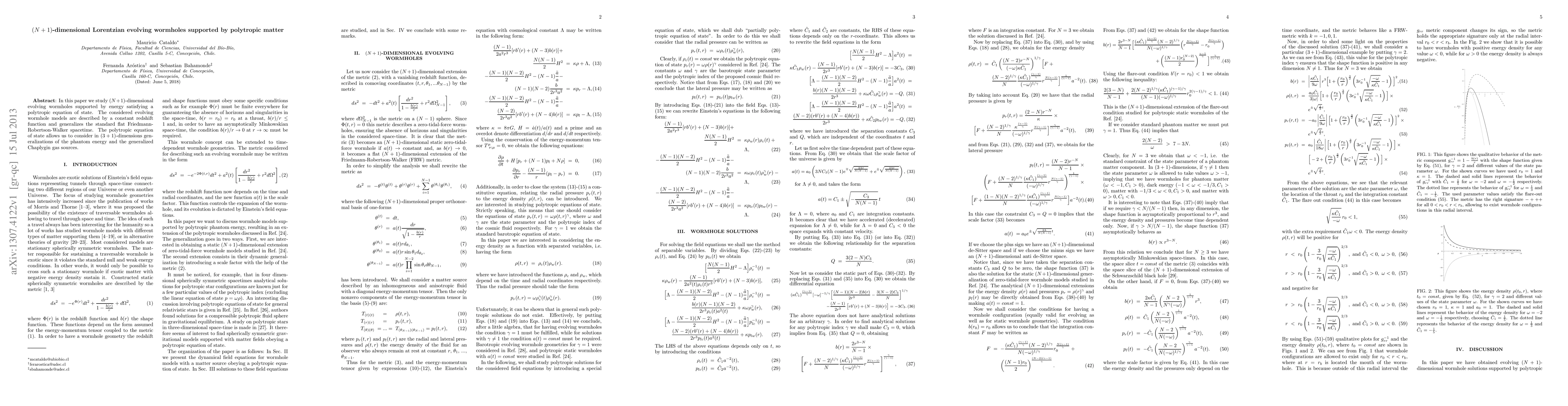 In this paper we study $(N+1)$-dimensional evolving wormholes supported by energy satisfying a polytropic equation of state. The considered evolving wormhole models are described by a constant redshift function and generalizes the standard flat Friedmann-Robertson-Walker spacetime. The polytropic equation of state allows us to consider in $(3+1)$-dimensions generalizations of the phantom energy and the generalized Chaplygin gas sources.