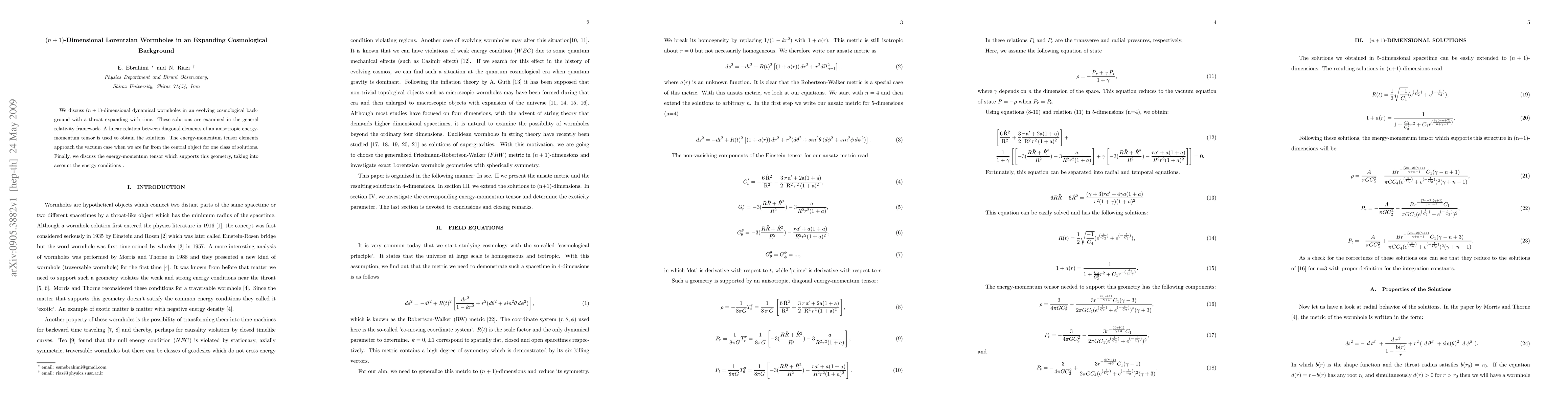 We discuss $(n+1)$-dimensional dynamical wormholes in an evolving cosmological background with a throat expanding with time. These solutions are examined in the general relativity framework. A linear relation between diagonal elements of an anisotropic energy-momentum tensor is used to obtain the solutions. The energy-momentum tensor elements approach the vacuum case when we are far from the central object for one class of solutions. Finally, we discuss the energy-momentum tensor which supports this geometry, taking into account the energy conditions .