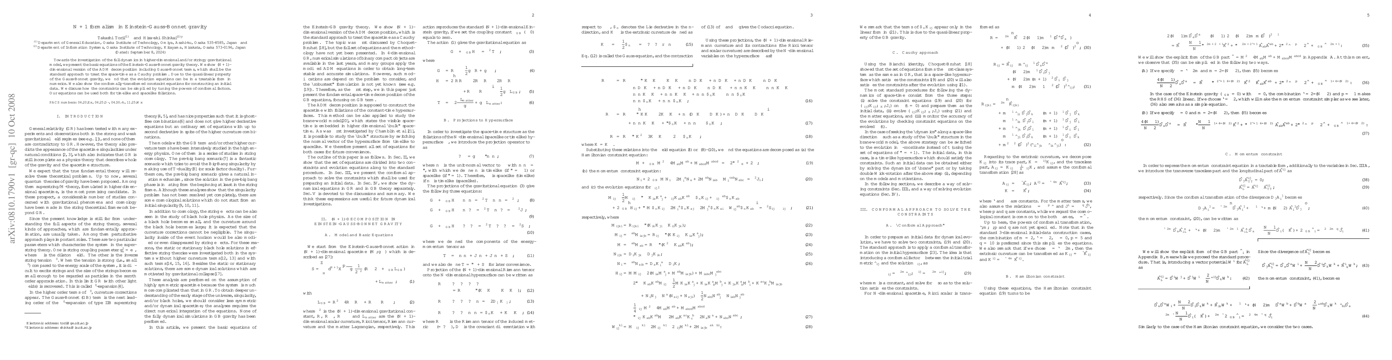 Towards the investigation of the full dynamics in higher-dimensional and/or stringy gravitational model, we present the basic equations of the Einstein-Gauss-Bonnet gravity theory. We show $(N+1)$-dimensional version of the ADM decomposition including Gauss-Bonnet terms, which shall be the standard approach to treat the space-time as a Cauchy problem. Due to the quasi-linear property of the Gauss-Bonnet gravity, we find that the evolution equations can be in a treatable form in numerics. We also show the conformally-transformed constraint equations for constructing an initial data. We discuss how the constraints can be simplified by tuning the powers of conformal factors. Our equations can be used both for timelike and spacelike foliations.