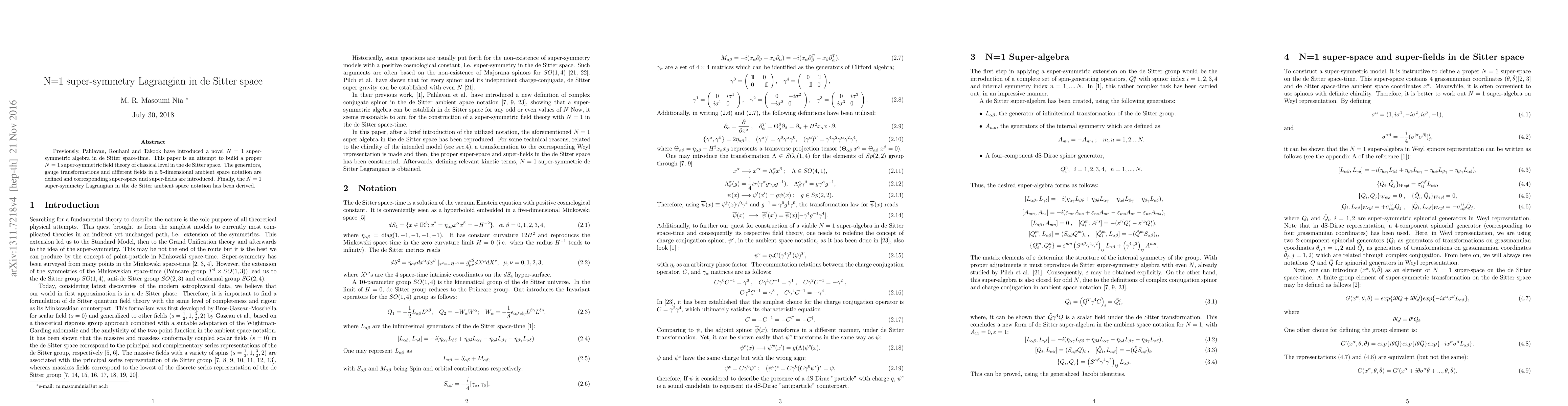 This paper constructs an $N=1$ super-symmetric field theory in de Sitter space, defining generators, gauge transformations, and fields in a 5-dimensional ambient space, and derives the corresponding $N=1$ super-symmetry Lagrangian.