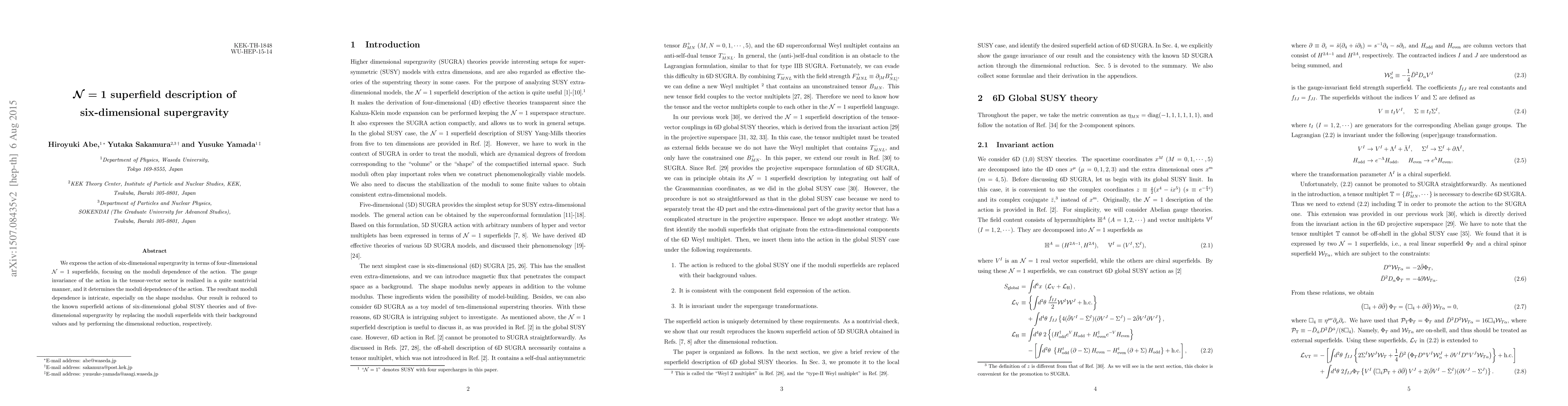 This paper presents an N=1 superfield description of six-dimensional supergravity, highlighting the complex moduli dependence, particularly on the shape modulus, through gauge invariance in the tensor-vector sector. The results align with known actions for global SUSY theories and five-dimensional supergravity upon appropriate reductions.