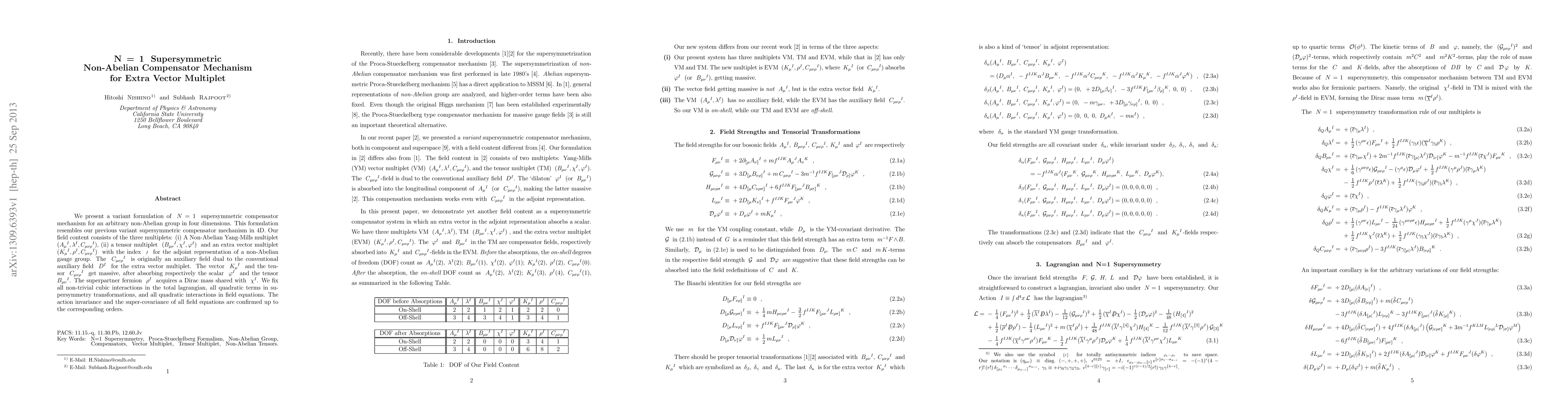 This paper proposes a new N=1 supersymmetric compensator mechanism for non-Abelian groups in four dimensions, featuring three multiplets: a Non-Abelian Yang-Mills, a tensor, and an extra vector multiplet. The vector and tensor fields acquire mass through field absorption, and the superpartner fermion obtains a Dirac mass. The formulation ensures invariance and super-covariance of the action and field equations.