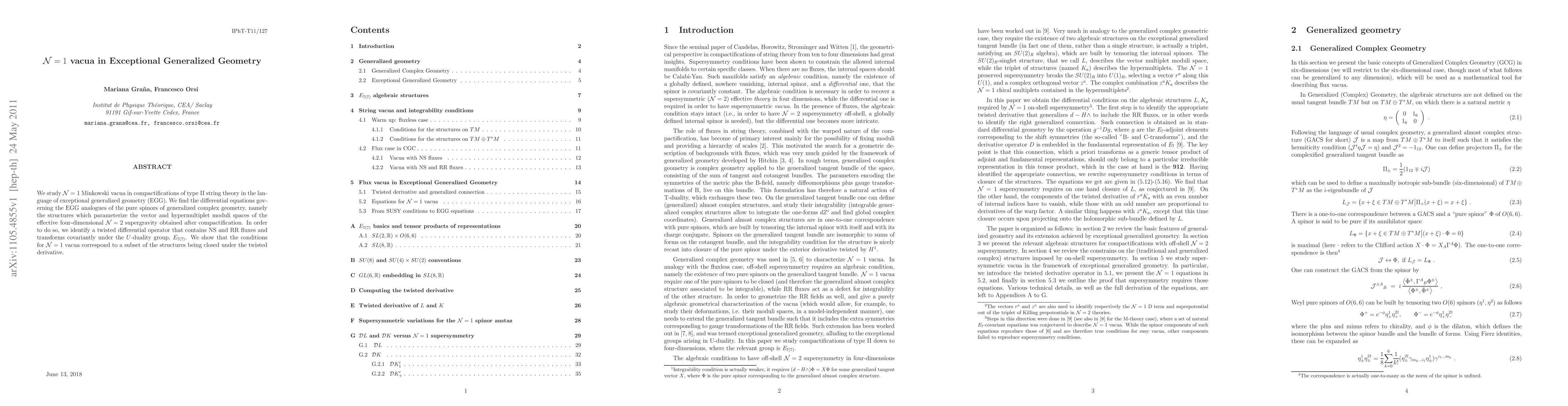 This paper investigates N=1 Minkowski vacua in type II string theory compactifications using exceptional generalized geometry (EGG). It identifies a twisted differential operator that governs the EGG analogues of pure spinors, revealing conditions for N=1 vacua when these structures are closed under the twisted derivative.