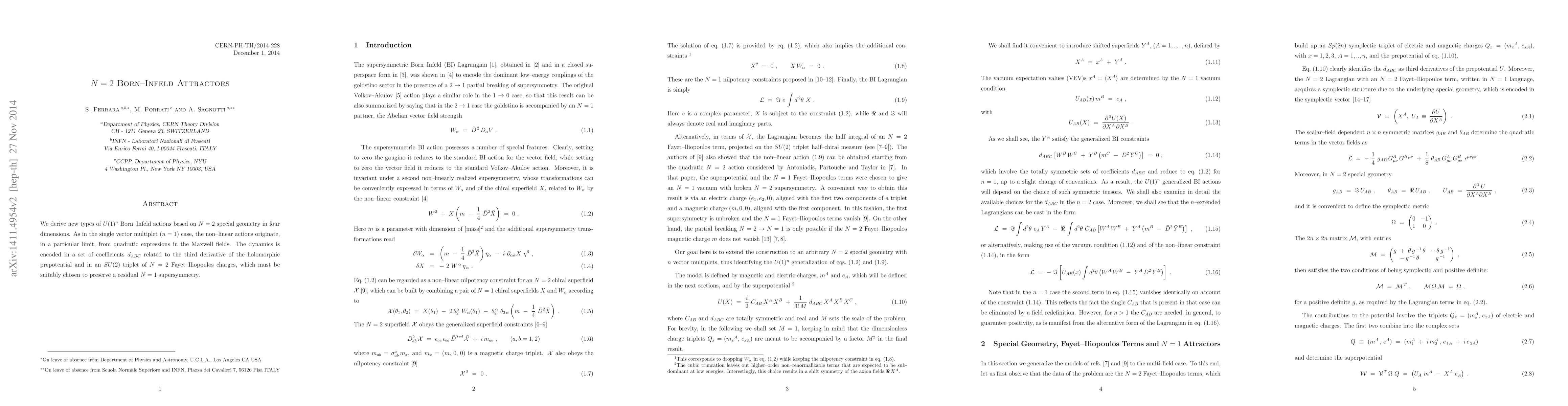 This paper introduces new $U(1)^n$ Born-Infeld actions derived from N=2 special geometry in four dimensions, where the nonlinear dynamics are linked to specific SU(2) triplet charges and coefficients, preserving residual N=1 supersymmetry. These actions generalize the single vector multiplet scenario to multiple vector multiplets.