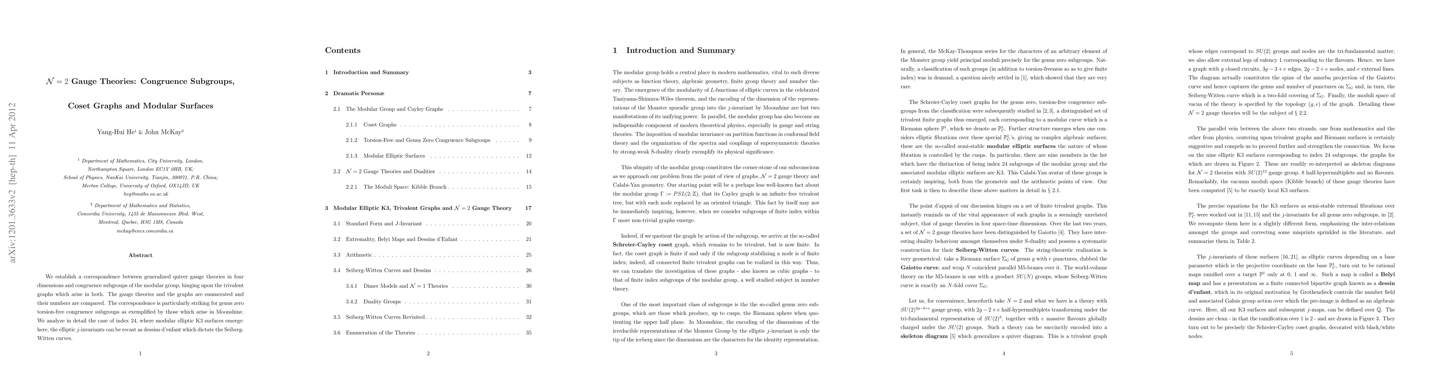 This paper establishes a connection between four-dimensional N=2 gauge theories and congruence subgroups of the modular group, using trivalent graphs. It highlights the striking correspondence for genus zero torsion-free subgroups, particularly focusing on the index 24 case where modular elliptic K3 surfaces and dessins d'enfant emerge.