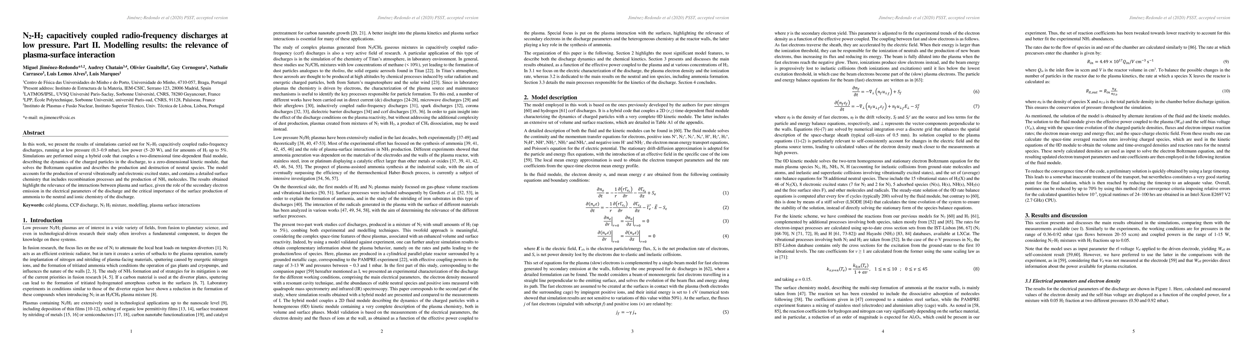 This paper presents simulation results for N2-H2 capacitively coupled radio-frequency discharges at low pressure, emphasizing the significance of plasma-surface interactions. The hybrid model highlights the role of secondary electron emission and surface chemistry in determining discharge electrical parameters and ammonia production.
