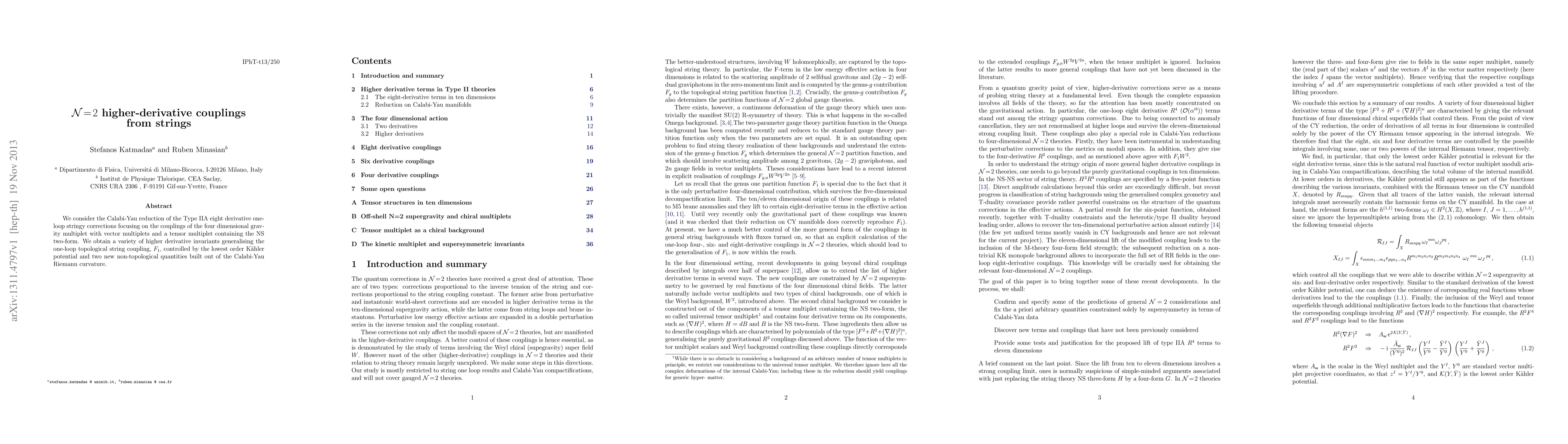 We consider the Calabi-Yau reduction of the Type IIA eight derivative one-loop stringy corrections focusing on the couplings of the four dimensional gravity multiplet with vector multiplets and a tensor multiplet containing the NS two-form. We obtain a variety of higher derivative invariants generalising the one-loop topological string coupling, $F_1$, controlled by the lowest order Kahler potential and two new non-topological quantities built out of the Calabi-Yau Riemann curvature.