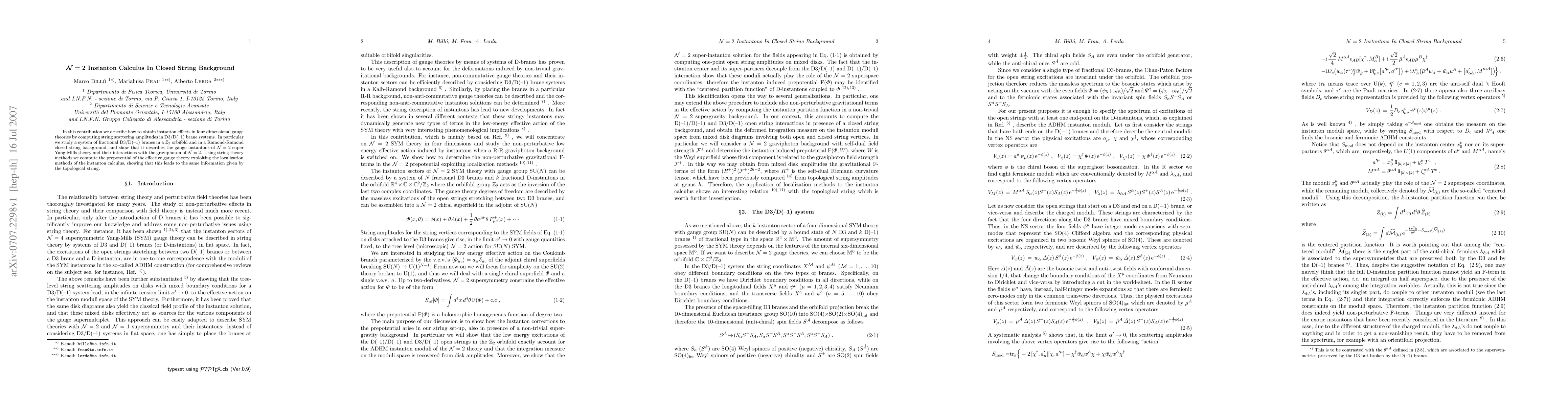 In this contribution we describe how to obtain instanton effects in four dimensional gauge theories by computing string scattering amplitudes in D3/D(-1) brane systems. In particular we study a system of fractional D3/D(-1) branes in a Z_2 orbifold and in a Ramond-Ramond closed string background, and show that it describes the gauge instantons of N=2 super Yang-Mills theory and their interactions with the graviphoton of N=2. Using string theory methods we compute the prepotential of the effective gauge theory exploiting the localization methods of the instanton calculus, showing that this leads to the same information given by the topological string.