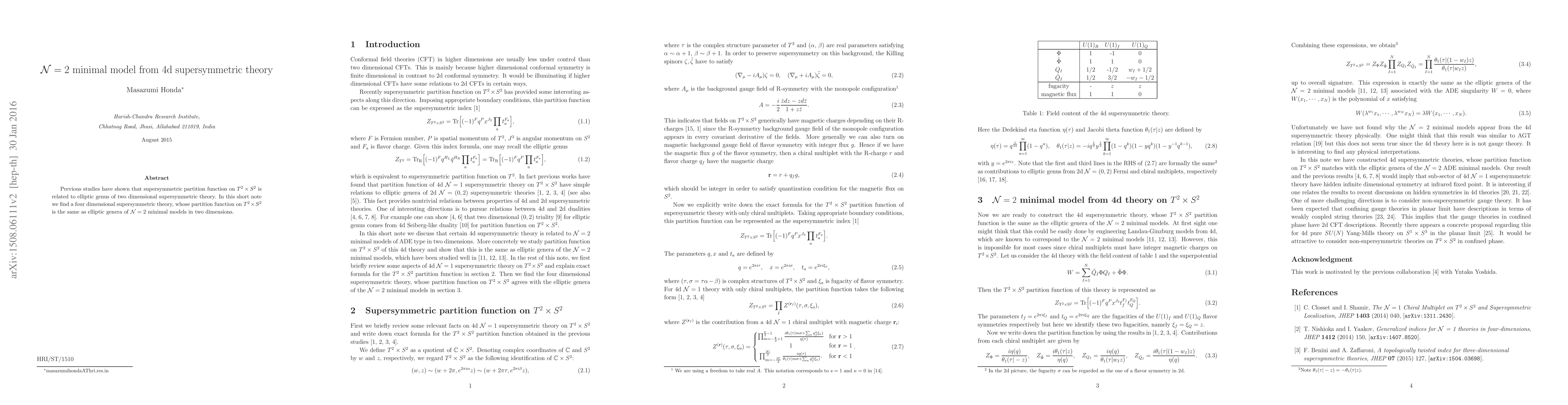 This paper identifies a four-dimensional supersymmetric theory whose partition function on $T^2 \times S^2$ matches the elliptic genus of $\mathcal{N}=2$ minimal models in two dimensions, establishing a connection between higher-dimensional supersymmetric theories and lower-dimensional supersymmetric minimal models.