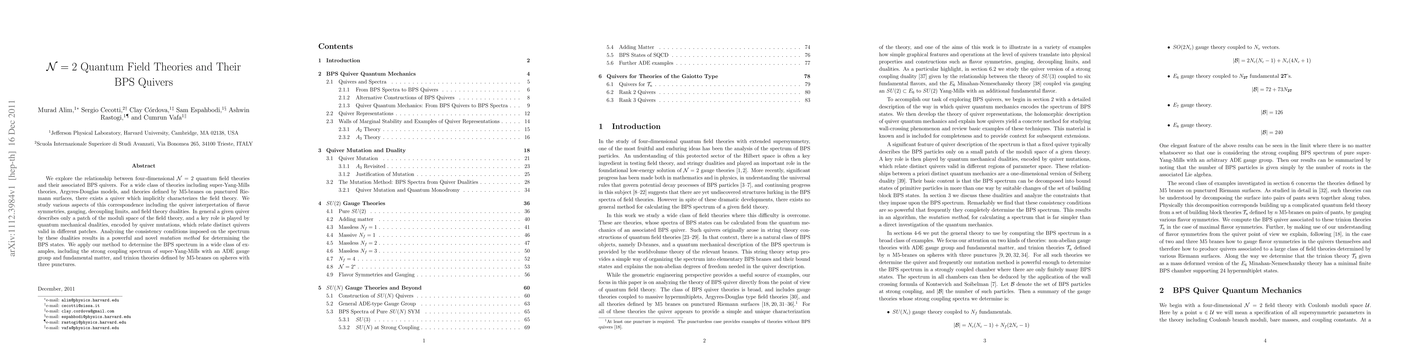 This paper investigates the connection between four-dimensional N=2 quantum field theories and their BPS quivers, highlighting the quiver's role in characterizing these theories and analyzing flavor symmetries, gauging, and dualities. The authors propose a mutation method to determine the BPS spectrum, applying it to various examples including super-Yang-Mills and trinion theories.