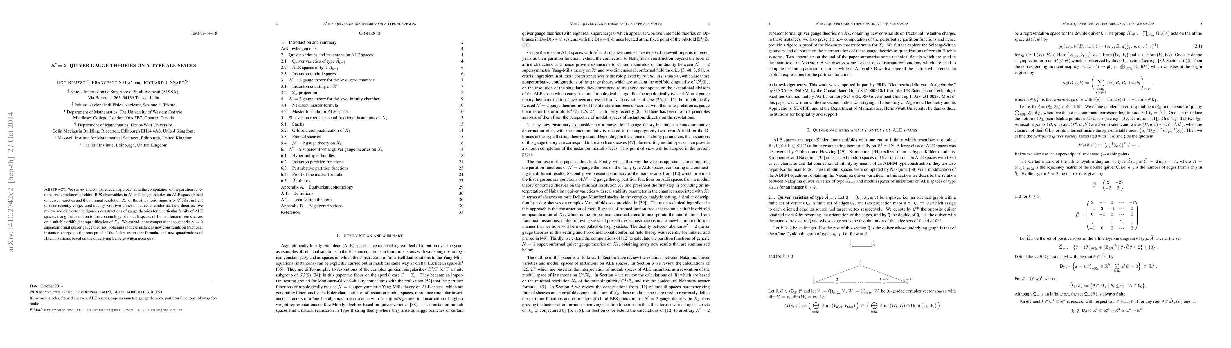 We survey and compare recent approaches to the computation of the partition functions and correlators of chiral BPS observables in $\mathcal{N}=2$ gauge theories on ALE spaces based on quiver varieties and the minimal resolution $X_k$ of the $A_{k-1}$ toric singularity $\mathbb{C}^2/\mathbb{Z}_k$, in light of their recently conjectured duality with two-dimensional coset conformal field theories. We review and elucidate the rigorous constructions of gauge theories for a particular family of ALE spaces, using their relation to the cohomology of moduli spaces of framed torsion free sheaves on a suitable orbifold compactification of $X_k$. We extend these computations to generic $\mathcal{N}=2$ superconformal quiver gauge theories, obtaining in these instances new constraints on fractional instanton charges, a rigorous proof of the Nekrasov master formula, and new quantizations of Hitchin systems based on the underlying Seiberg-Witten geometry.
