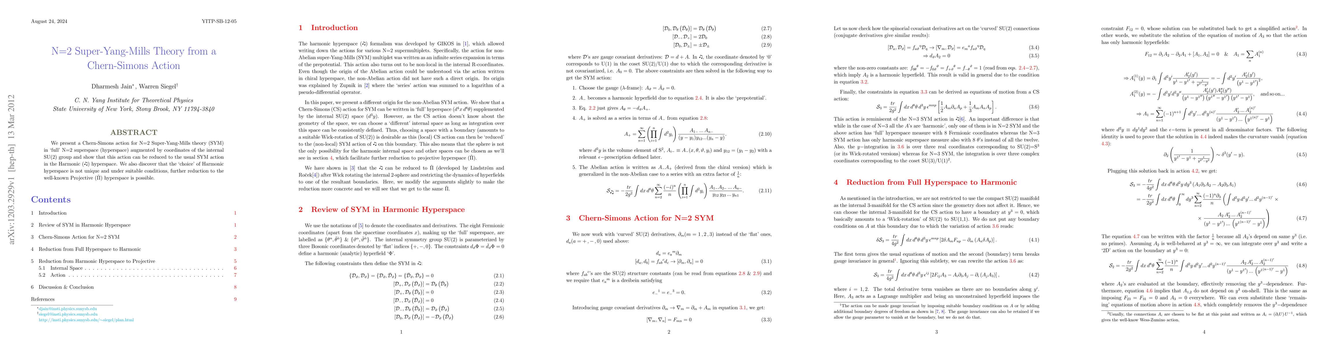 We present a Chern-Simons action for N=2 Super-Yang-Mills theory (SYM) in 'full' N=2 superspace (hyperspace) augmented by coordinates of the internal SU(2) group and show that this action can be reduced to the usual SYM action in the Harmonic hyperspace. We also discover that the 'choice' of Harmonic hyperspace is not unique and under suitable conditions, further reduction to the well-known Projective hyperspace is possible.