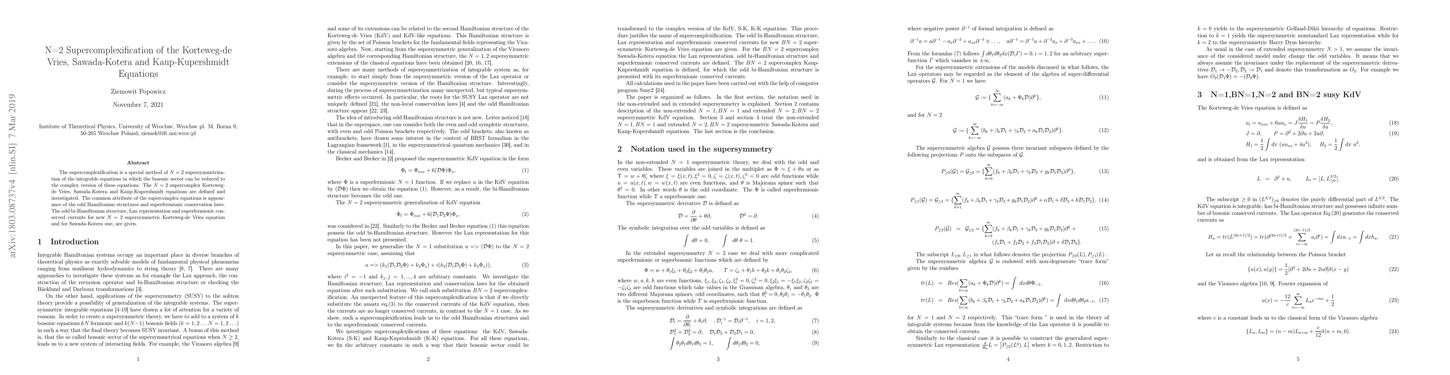 This paper explores the N=2 supercomplexification of the Korteweg-de Vries, Sawada-Kotera, and Kaup-Kupershmidt equations, introducing odd Hamiltonian structures and superfermionic conservation laws. It provides detailed formulations of the supercomplex versions of these equations, including their bi-hamiltonian structures and conserved currents.