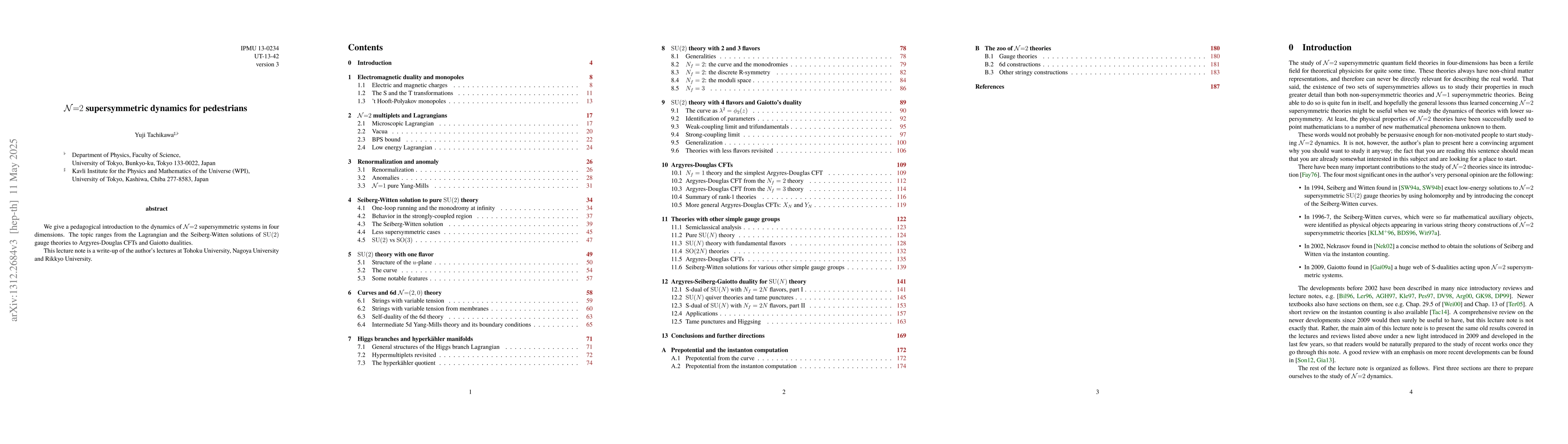 We give a pedagogical introduction to the dynamics of N=2 supersymmetric systems in four dimensions. The topic ranges from the Lagrangian and the Seiberg-Witten solutions of SU(2) gauge theories to Argyres-Douglas CFTs and Gaiotto dualities. This is a write-up of the author's lectures at Tohoku University, Nagoya University and Rikkyo University. Comments will be appreciated.