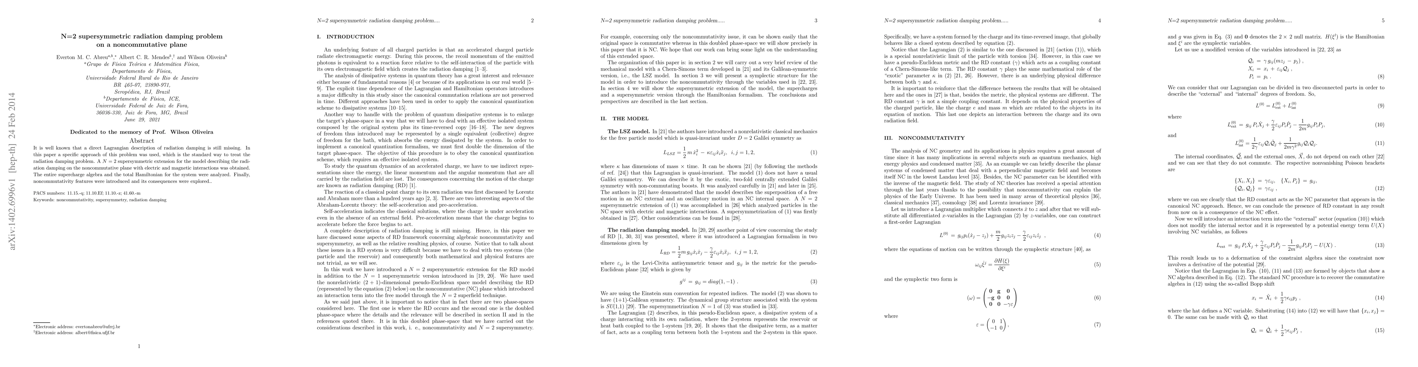 It is well known that a direct Lagrangian description of radiation damping is still missing. In this paper a specific approach of this problem was used, which is the standard way to treat the radiation damping problem. A $N=2$ supersymmetric extension for the model describing the radiation damping on the noncommutative plane with electric and magnetic interactions was obtained. The entire supercharge algebra and the total Hamiltonian for the system were analyzed. Finally, noncommutativity features were introduced and its consequences were explored..