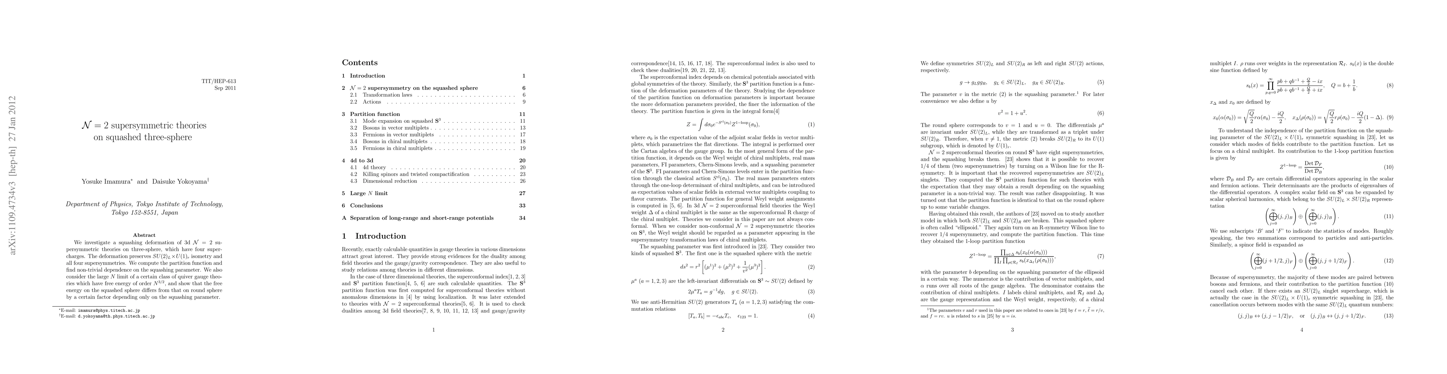 This paper examines a squashing deformation of 3d N=2 supersymmetric theories on a three-sphere, preserving SU(2)_L x U(1)_r symmetry and all four supercharges, and computes a partition function showing non-trivial dependence on the squashing parameter. It also analyzes a large N limit of quiver gauge theories, finding that their free energy on a squashed sphere differs from that on a round sphere by a squashing parameter-dependent factor.