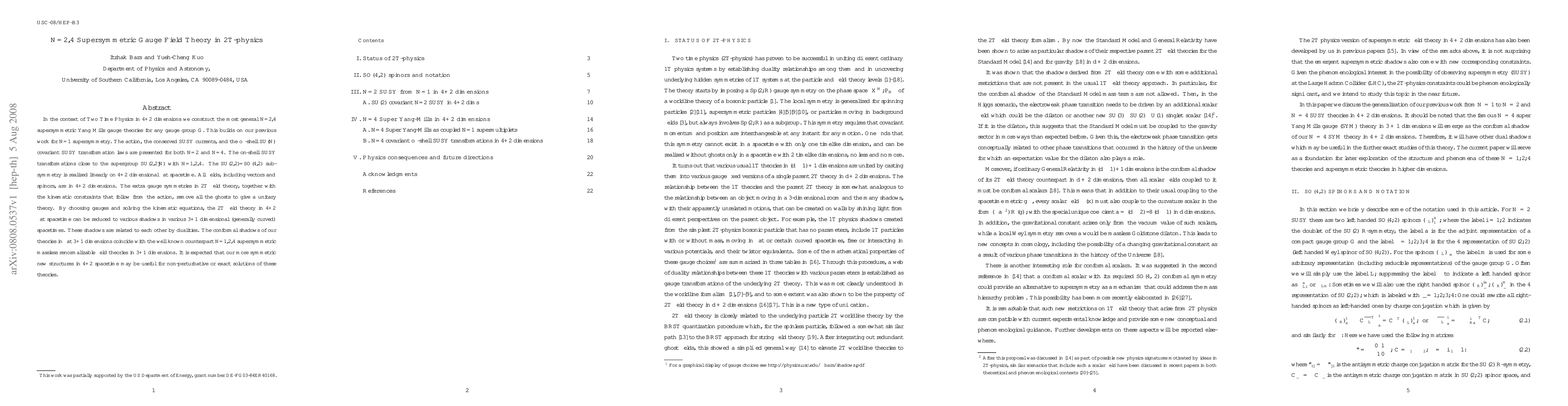In the context of Two Time Physics in 4+2 dimensions we construct the most general N=2,4 supersymmetric Yang Mills gauge theories for any gauge group G. This builds on our previous work for N=1 supersymmetry. The action, the conserved SUSY currents, and the off-shell SU(N) covariant SUSY transformation laws are presented for both N=2 and N=4. The on-shell SUSY transformations close to the supergroup SU(2,2$|$N) with N=1,2,4. The SU(2,2)=SO(4,2) sub-symmetry is realized linearly on 4+2 dimensional flat spacetime. All fields, including vectors and spinors, are in 4+2 dimensions. The extra gauge symmetries in 2T field theory, together with the kinematic constraints that follow from the action, remove all the ghosts to give a unitary theory. By choosing gauges and solving the kinematic equations, the 2T field theory in 4+2 flat spacetime can be reduced to various shadows in various 3+1 dimensional (generally curved) spacetimes. These shadows are related to each other by dualities. The conformal shadows of our theories in flat 3+1 dimensions coincide with the well known counterpart N=1,2,4 supersymmetric massless renormalizable field theories in 3+1 dimensions. It is expected that our more symmetric new structures in 4+2 spacetime may be useful for non-perturbative or exact solutions of these theories.