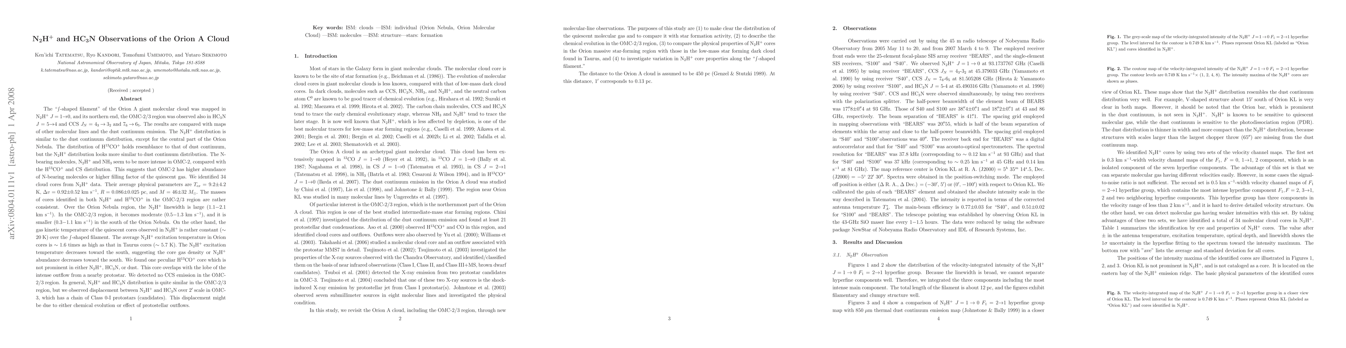 This study mapped the Orion A molecular cloud using N2H+ and observed the OMC-2/3 region with HC3N and CCS. N2H+ distribution closely matches the dust continuum, especially in the OMC-2/3 region, where N-bearing molecules are more intense compared to H13CO+ and CS. The N2H+ linewidth varies across the cloud, with the highest values near the Orion Nebula.