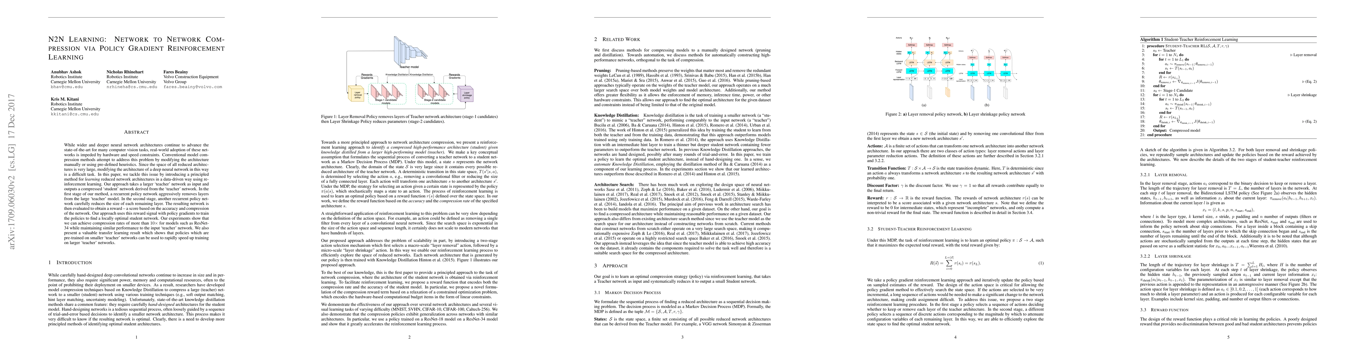 While bigger and deeper neural network architectures continue to advance the state-of-the-art for many computer vision tasks, real-world adoption of these networks is impeded by hardware and speed constraints. Conventional model compression methods attempt to address this problem by modifying the architecture manually or using pre-defined heuristics. Since the space of all reduced architectures is very large, modifying the architecture of a deep neural network in this way is a difficult task. In this paper, we tackle this issue by introducing a principled method for learning reduced network architectures in a data-driven way using reinforcement learning. Our approach takes a larger `teacher' network as input and outputs a compressed `student' network derived from the `teacher' network. In the first stage of our method, a recurrent policy network aggressively removes layers from the large `teacher' model. In the second stage, another recurrent policy network carefully reduces the size of each remaining layer. The resulting network is then evaluated to obtain a reward -- a score based on the accuracy and compression of the network. Our approach uses this reward signal with policy gradients to train the policies to find a locally optimal student network. Our experiments show that we can achieve compression rates of more than 10x for models such as ResNet-34 while maintaining similar performance to the input `teacher' network. We also present a valuable transfer learning result which shows that policies which are pre-trained on smaller `teacher' networks can be used to rapidly speed up training on larger `teacher' networks.