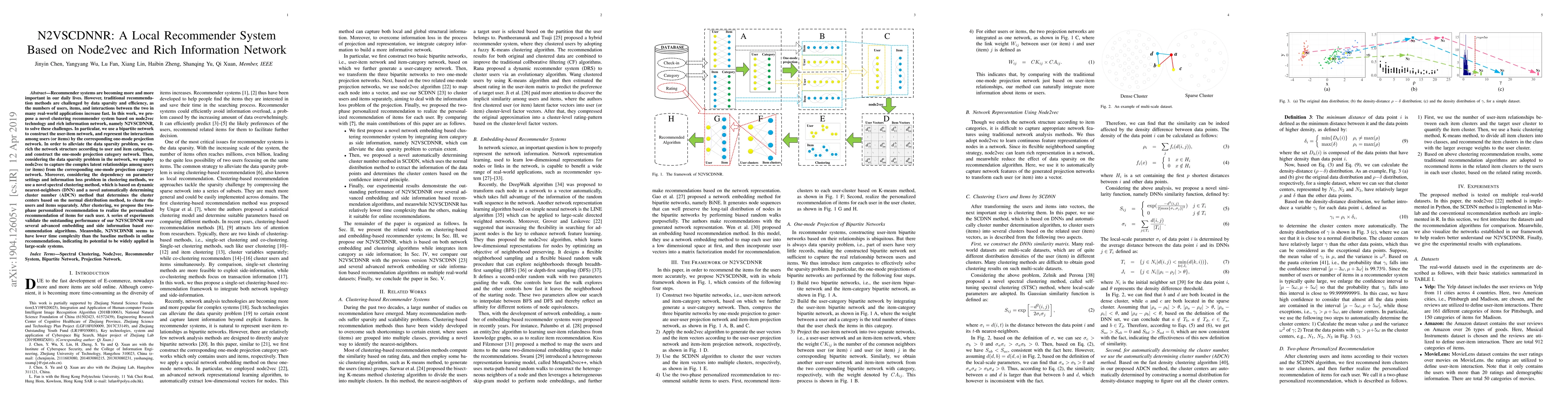 This paper introduces N2VSCDNNR, a novel recommender system that uses node2vec to capture complex user-item relationships and spectral clustering for personalized recommendations, outperforming existing methods in several experiments.