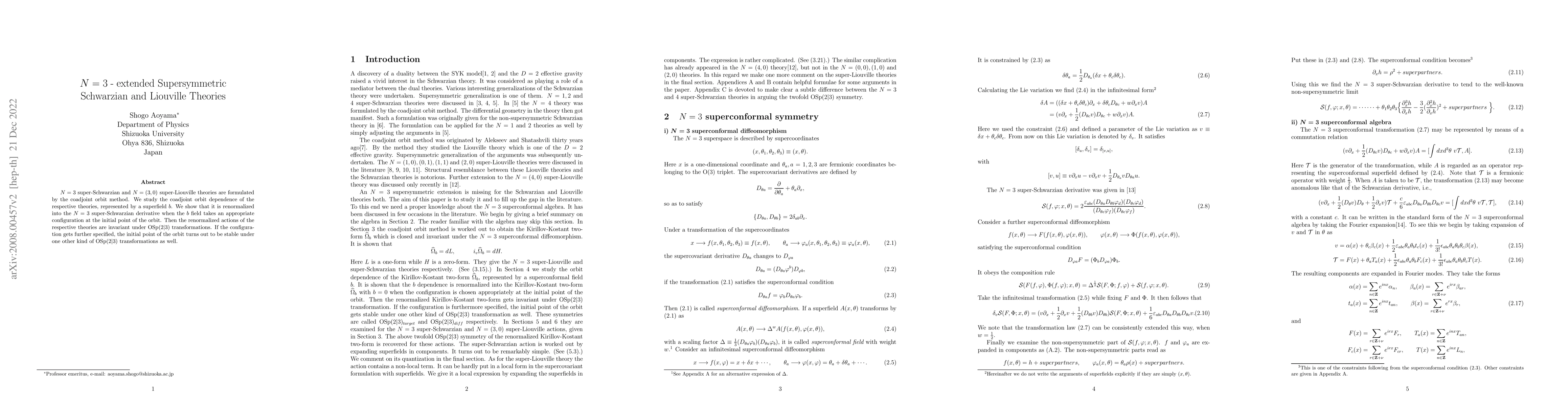 N=3 super-Schwarzian and N=(3,0) super-Liouville theories are formulated by the coadjoint orbit method. We study the coadjoint orbit dependence of the respective theories, represented by a superfield b. We show that it is renormalized into the N=3 super-Schwarzian derivative when the b field takes an appropriate configuration at the initial point of the orbit. Then the renormalized actions of the respective theories are invariant under OSp(2$|$3) transformations. If the configuration gets further specified, the initial point of the orbit turns out to be stable under one other kind of OSp(2$|$3) transformations as well.