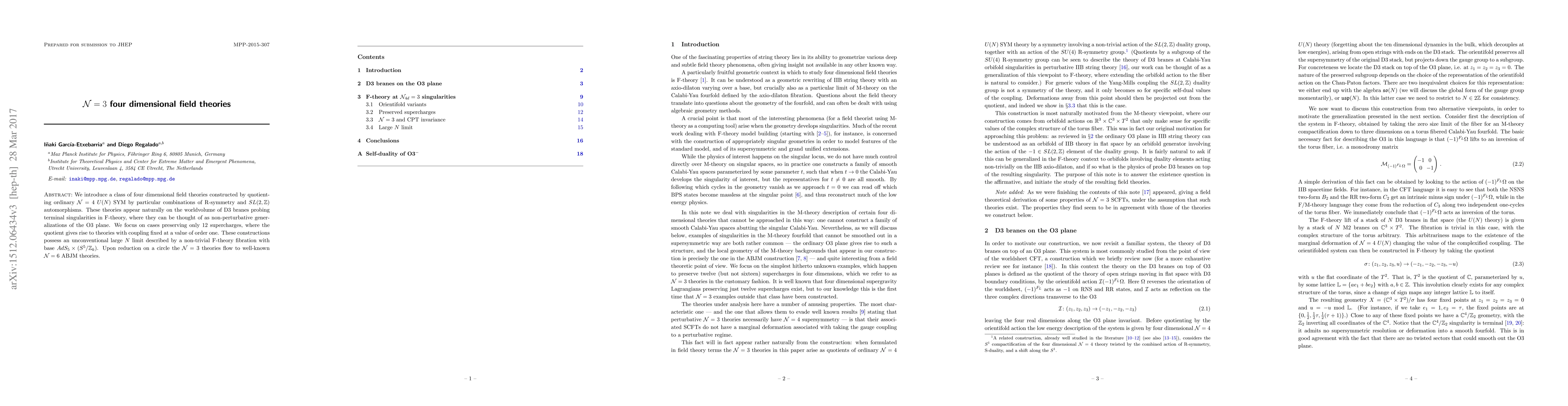This paper constructs $\mathcal{N}=3$ four-dimensional field theories by quotienting $\mathcal{N}=4$ $U(N)$ SYM, revealing their natural occurrence on D3 branes in F-theory. These theories exhibit a unique large $N$ limit and reduce to $\mathcal{N}=6$ ABJM theories.