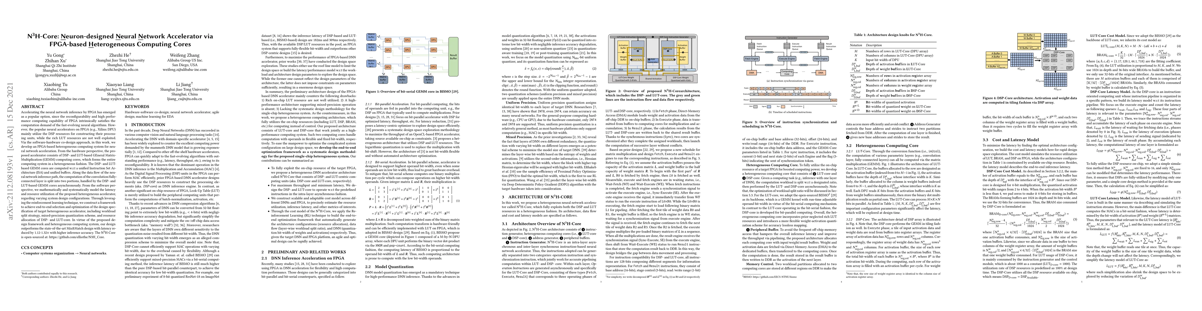 This paper presents an FPGA-based heterogeneous computing system, N3H-Core, for accelerating neural network inference by efficiently utilizing both DSP and LUT resources. The system leverages reinforcement learning to optimize design specifications, resulting in significant latency reduction and higher inference accuracy compared to existing accelerators.